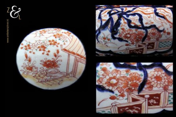Deze rechthoekige porseleinen Japans Imari bloempot is geheel gedecoreerd in de typische Imari kleuren en geschikt voor bijvoorbeeld een bonsaiboompje of orchidee en stamt uit de 19e eeuw. De Imari bloempot weegt 1913 gram en is 27.5 cm lang 22 cm breed en 12.5 cm hoog.