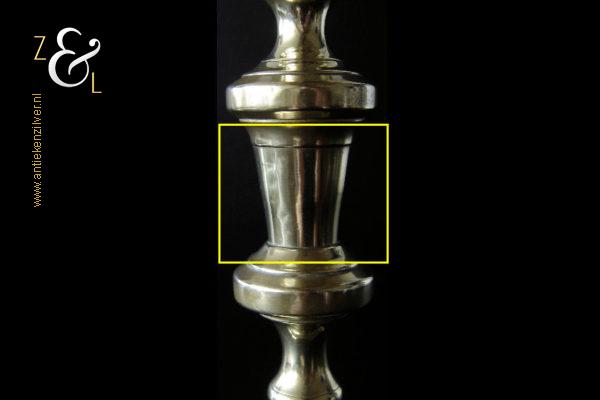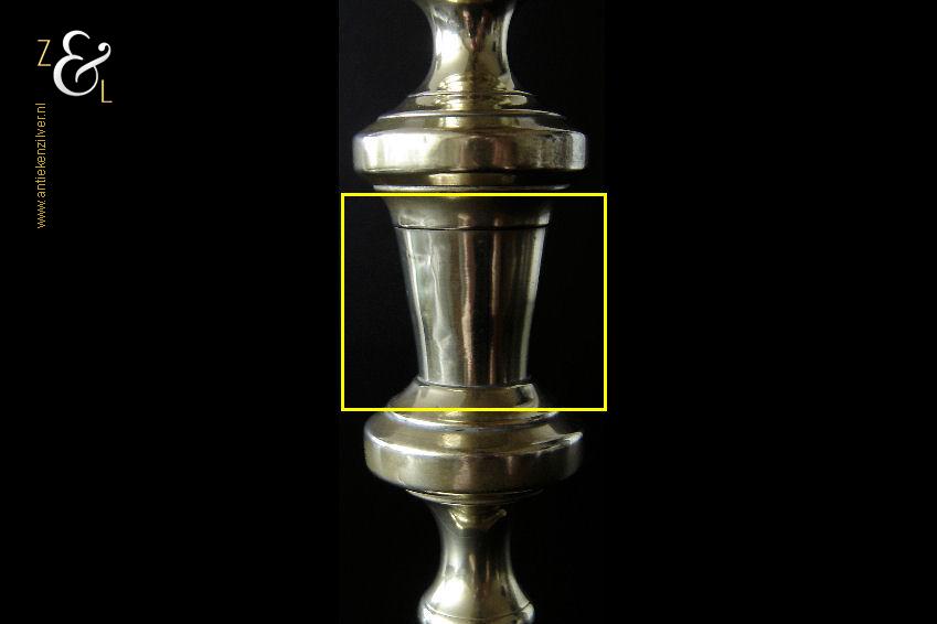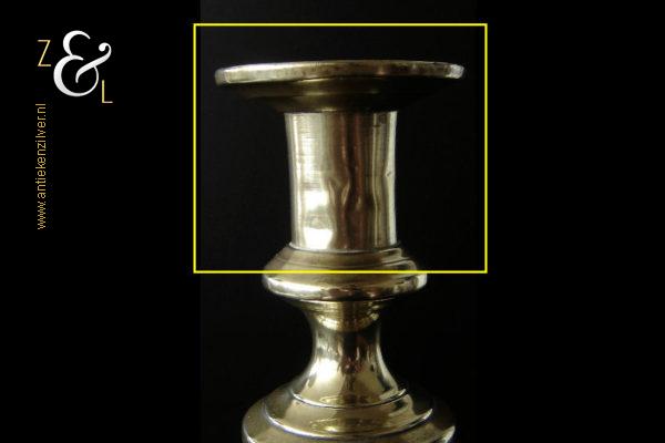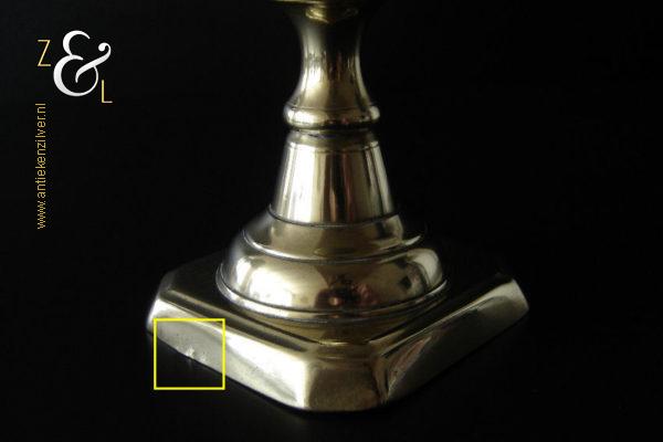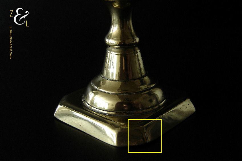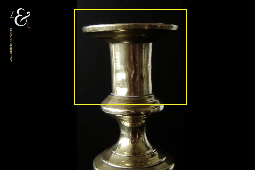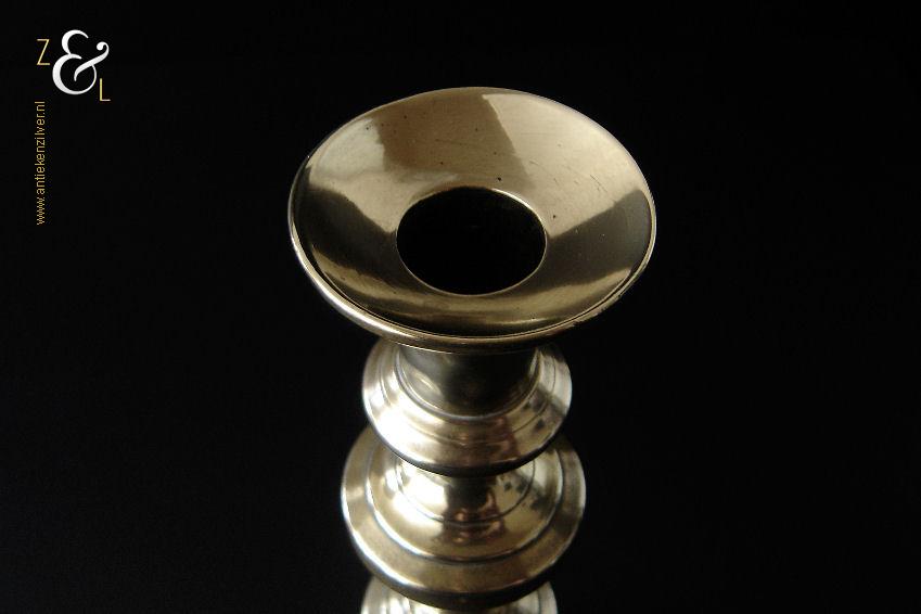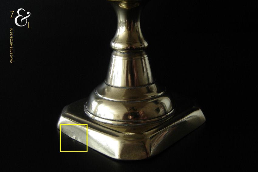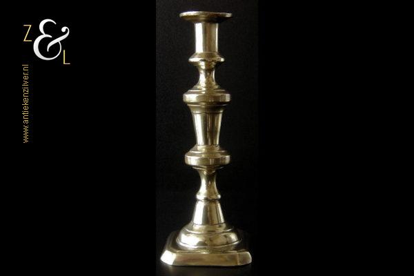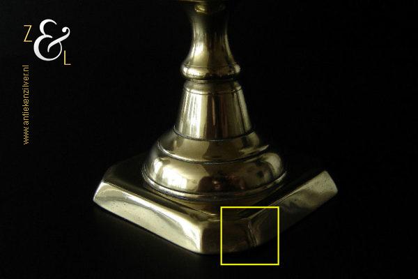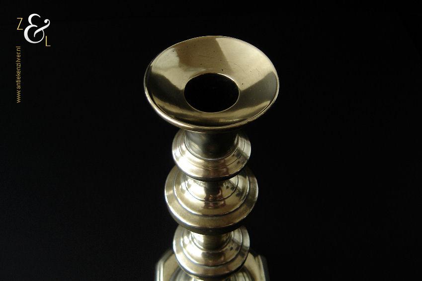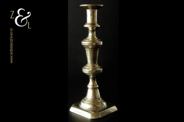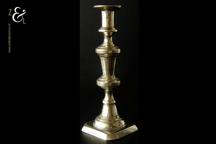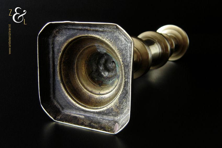 Deze messing kandelaar is gemaakt in Engeland tijdens de tweede helft van de 19e eeuw de Victoriaanse periode die liep van 1837 tot 1901. De kandelaar waarvan de balustervormige steel is uitgevoerd in Art Deco stijl is 24.5 cm hoog heeft een vierkante voet met afgeschuinde hoeken van 9.4 cm bij 9.4 cm en weegt 480 gram. De kandelaar is geschikt voor kaarsen met een diameter van 2.2 cm en heeft een bobèche (kaarsvetopvanger) met een diameter van 5.4 cm. De kandelaar heeft gebruikssporen (deukjes, een breukje in de voet en een licht verbogen bobèche) zie geel omkaderde gedeeltes op afbeeldingen.