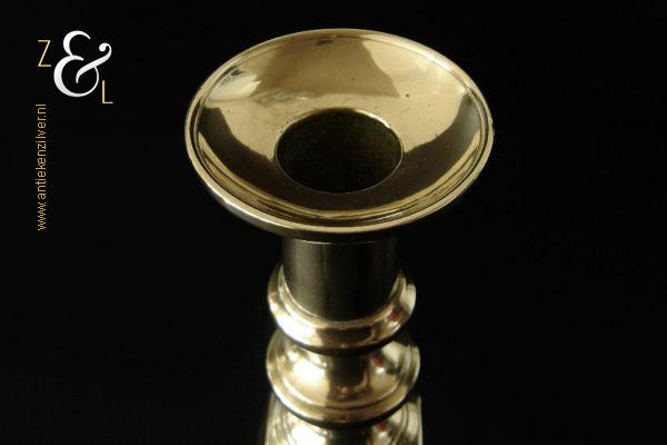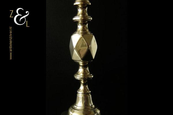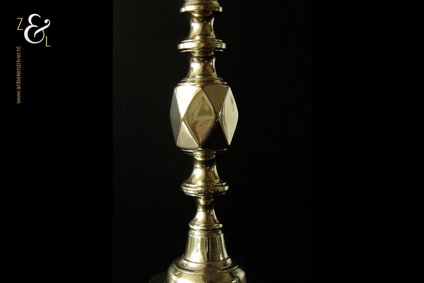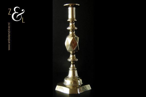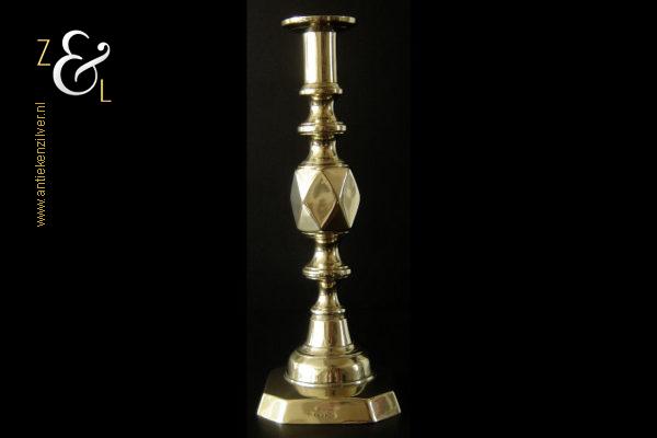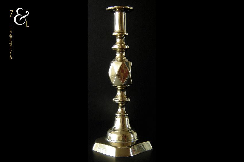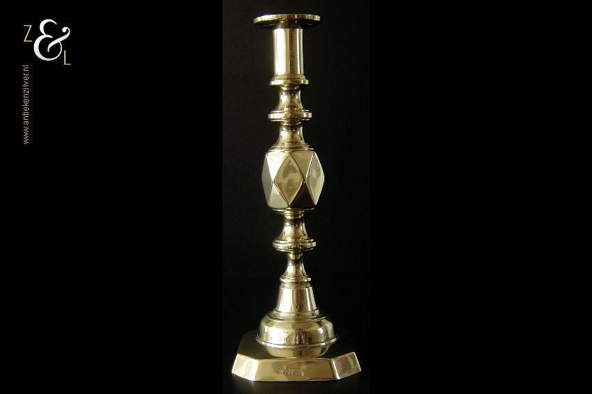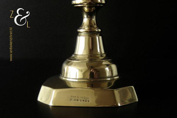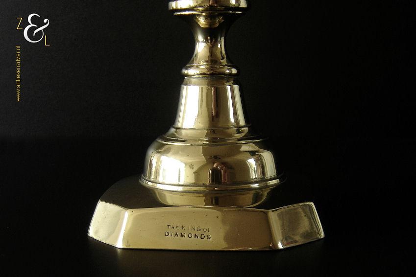 Deze messing kandelaar genaamd “The King of Diamonds” is gemaakt in Birmingham Engeland door James Clews and Sons tijdens de tweede helft van de 19e eeuw de Victoriaanse periode die liep van 1837 tot 1901. De kandelaar waarvan de balustervormige steel is uitgevoerd met een gefacetteerde knop (Diamond) is 31.5 cm hoog, heeft een vierkante voet met afgeschuinde hoeken van 12.1 cm bij 12.1 cm en weegt 974 gram. De kandelaar is geschikt voor kaarsen met een diameter van 2.5 cm en heeft een bobèche (kaarsvetopvanger) met een diameter van 6.3 cm. Bij de kandelaar is het ronde duwschijfje van het “Push up ejection mechanism” (duwuitwerp-mechanisme) kwijtgeraakt zie geel omkaderd gedeelte op afbeelding.