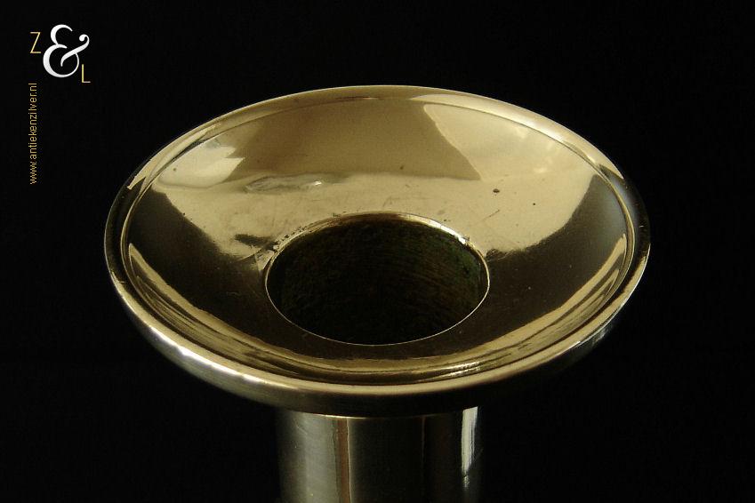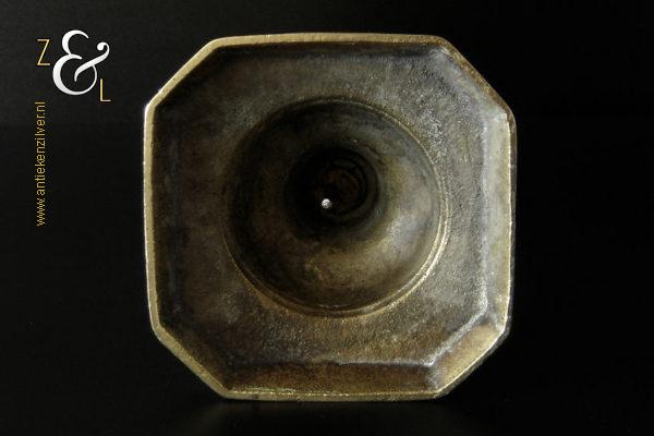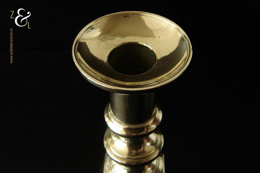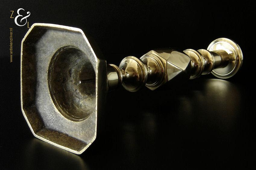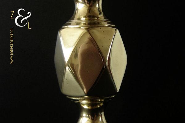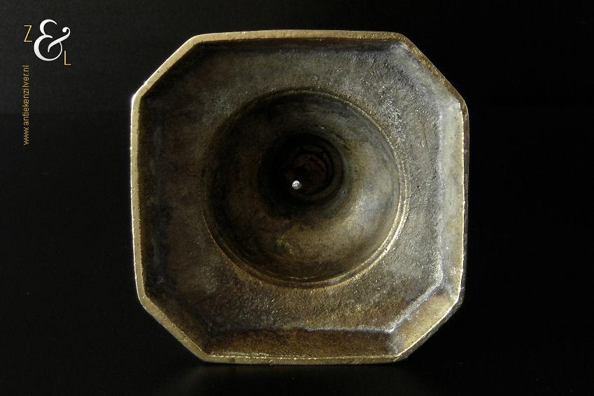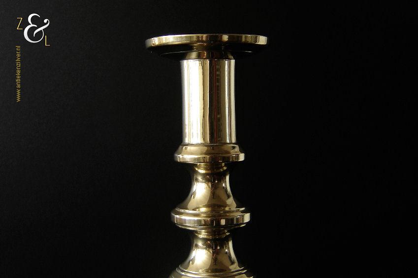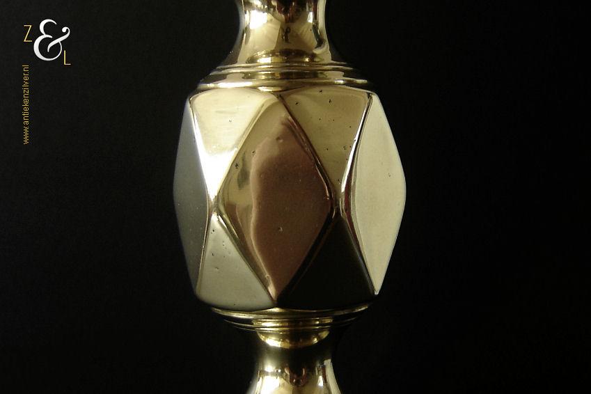 Deze messing kandelaar genaamd “The King of Diamonds” is gemaakt in Birmingham Engeland door James Clews and Sons tijdens de tweede helft van de 19e eeuw de Victoriaanse periode die liep van 1837 tot 1901. De kandelaar waarvan de balustervormige steel is uitgevoerd met een gefacetteerde knop (Diamond) is 31.5 cm hoog, heeft een vierkante voet met afgeschuinde hoeken van 12.1 cm bij 12.1 cm en weegt 974 gram. De kandelaar is geschikt voor kaarsen met een diameter van 2.5 cm en heeft een bobèche (kaarsvetopvanger) met een diameter van 6.3 cm. Bij de kandelaar is het ronde duwschijfje van het “Push up ejection mechanism” (duwuitwerp-mechanisme) kwijtgeraakt zie geel omkaderd gedeelte op afbeelding.