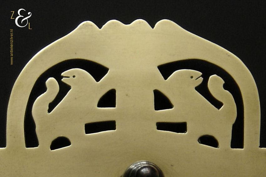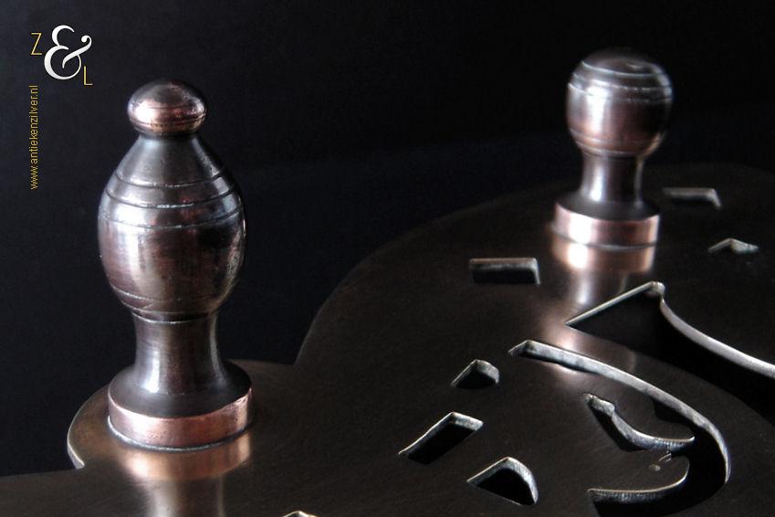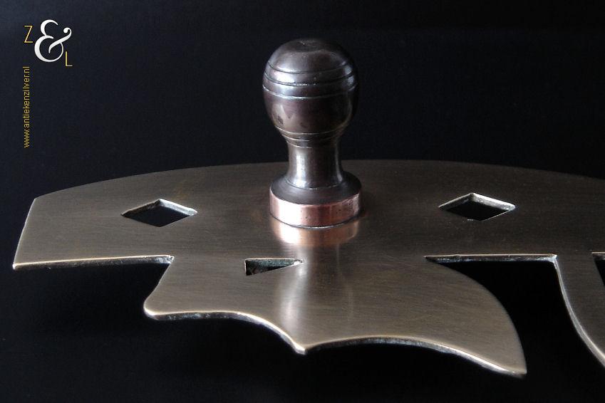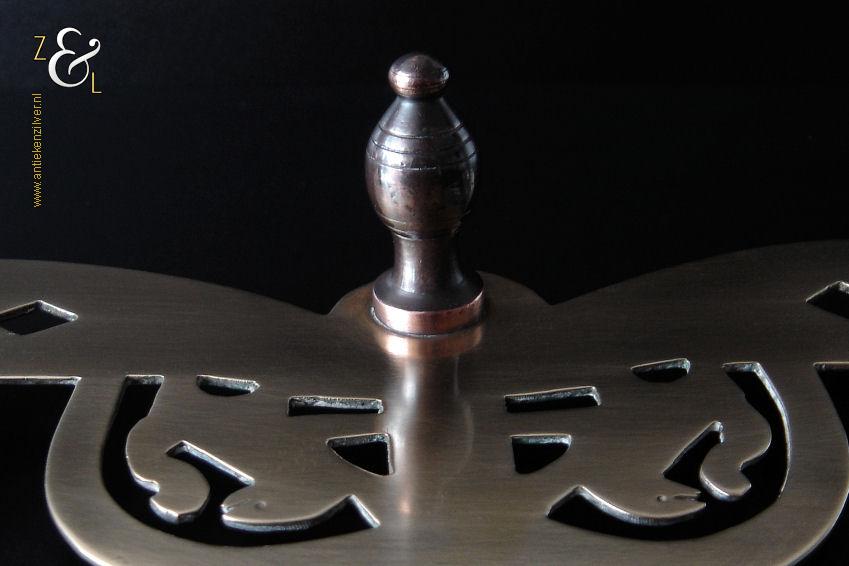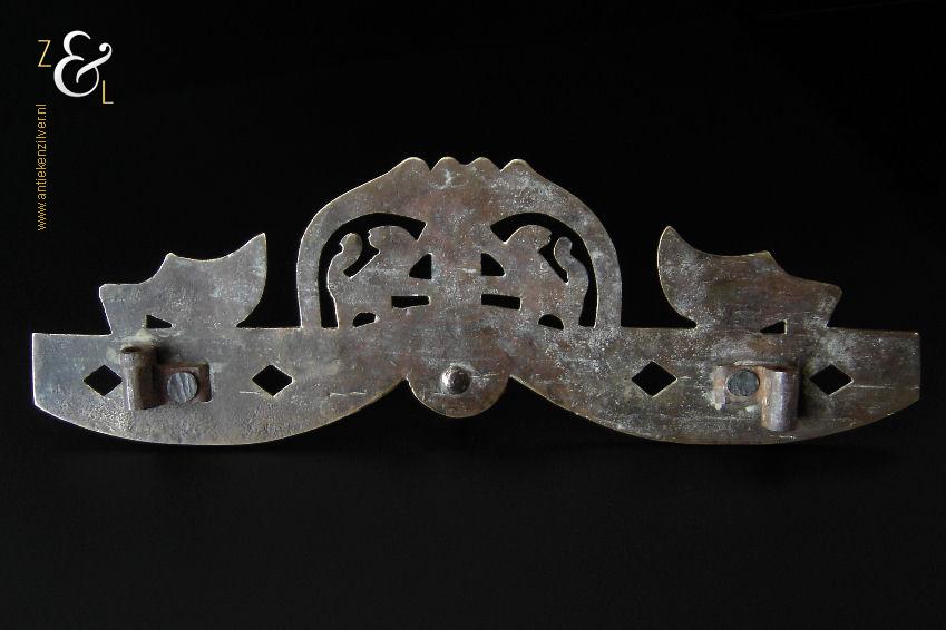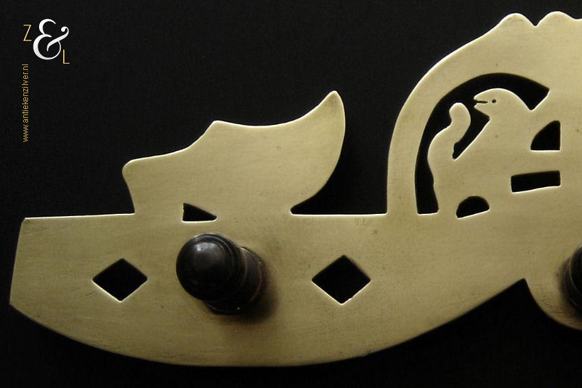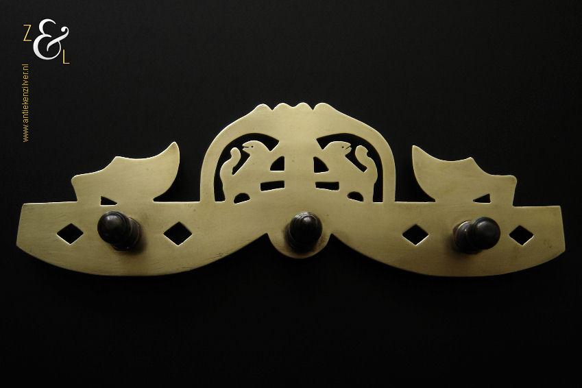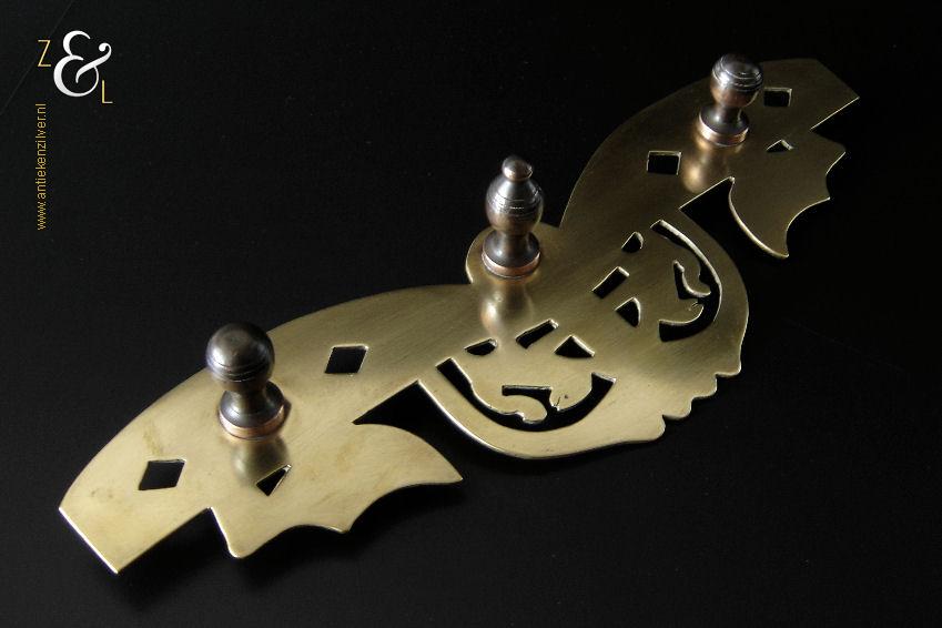 Dit kapstokje / wandrekje model klomp en eekhoorn is gemaakt in Nederland en stamt uit de tweede helft van de 19e eeuw. Het op de hand gemaakte kapstokje / wandrekje is uitgevoerd in zijdeglans messing en heeft drie massief gegoten koperen knoppen die de nog oude antieke donkere patina hebben. De middelste knop is 5 cm lang en de buitenste knoppen zijn 3.7 cm lang. Tevens heeft het kapstokje / wandrekje aan de achterzijde twee ijzeren ophangbeugels voor bevestiging aan de muur. Het kapstokje / wandrekje weegt 738 gram en is 36.8 cm lang bij 11.6 cm breed.