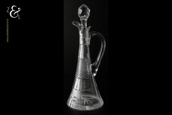 Deze Hollandse kristallen karaf met oor die uit het einde van de 19e eeuw stamt is mondgeblazen, handgeslepen en gepolijst. De karaf is bekroond met een facet geslepen stop die uitloopt in een punt en is verder (gezien van boven naar onder) geslepen met: drie ronde lenzen, zes ribben, een diamantpunt vlak, acht ribben, vijf olijven en aan de onderzijde op de bodem een ster. De karaf weegt 1054 gram heeft een diameter van 12.5 cm en is (inclusief stop) 32.5 cm hoog. De karaf heeft aan de binnenkant aanslag en aan de onderzijde van de stop zitten een paar kleine schilfertjes.