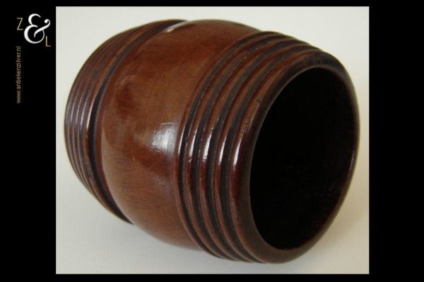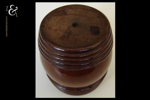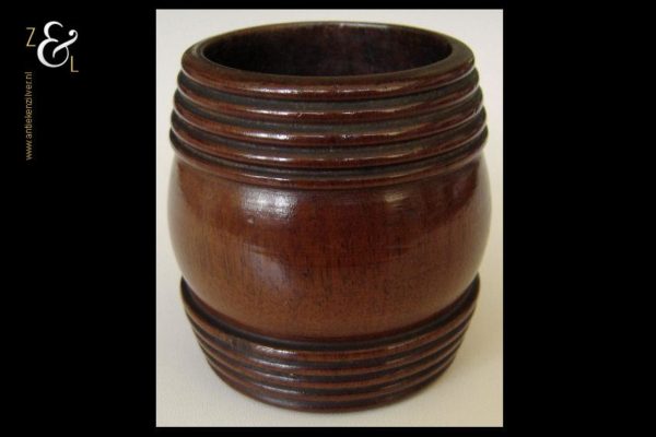 Dit houten kluwenbakje / knottenbakje in de vorm van een ton is in het midden van de 19e eeuw gemaakt in Nederland en stamt uit de Biedermeier periode. Het kluwenbakje / knottenbakje weegt 91 gram heeft een diameter van 7.6 cm en is 8.8 cm hoog. De voet heeft een diameter van 6.3 cm.
