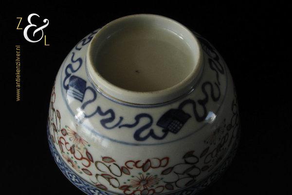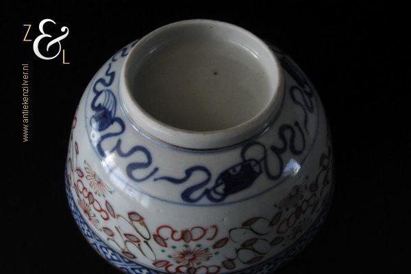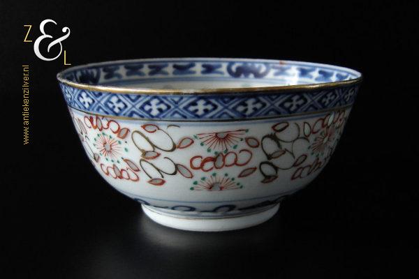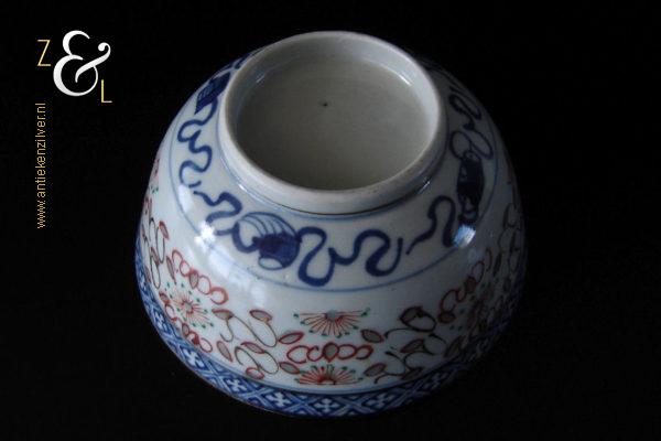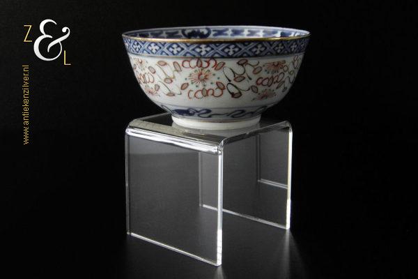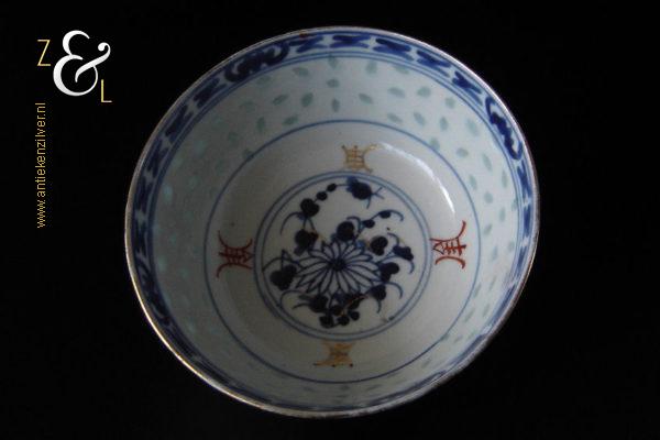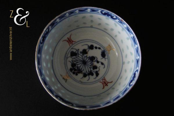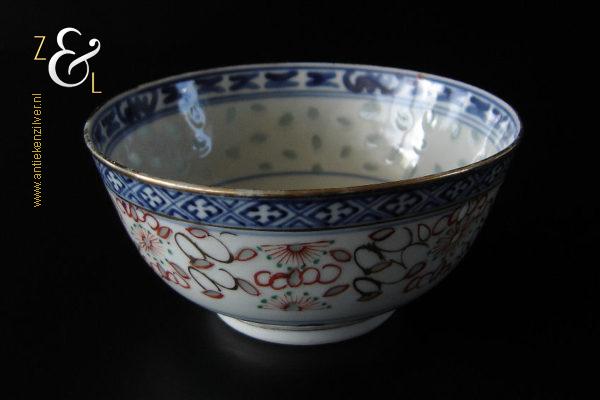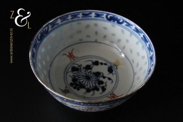Deze kom met doorschijnend rijst-ajour / rijstkorrel / rijstoog motief stamt uit de tweede helft van de 20e eeuw de Wanyu periode 1920-1970 en is gemaakt in China. De kom is op de hand beschilderd in de typische kleuren van Wanyu: blauw, ijzerrood en goud en gedecoreerd met blauwe randen en bloemen. Tevens is de kom aan de onderzijde gedecoreerd met vier gelukssymbolen. De kom weegt 171 gram heeft een diameter van 11.6 cm en is 5.5 cm hoog. De kom heeft héél lichte slijtagesporen en wordt verkocht exclusief perspex standaard.