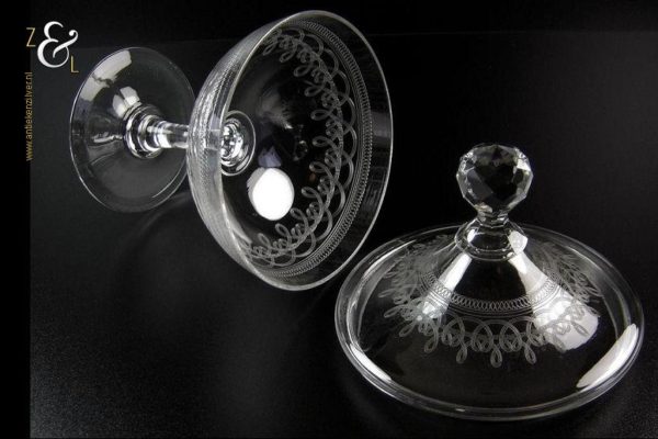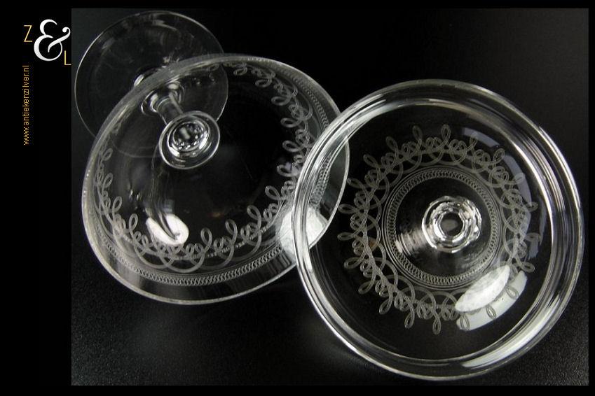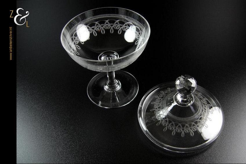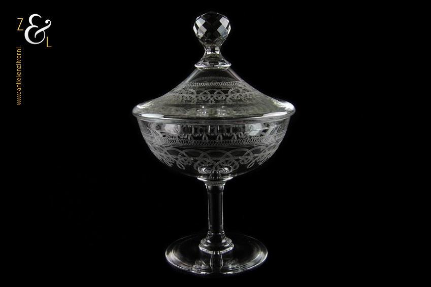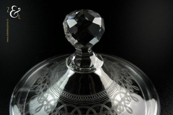 Deze Hollandse kristallen bonbonnière / drageoir / gembercoupe is gemaakt omstreeks de helft van de vorige eeuw. De bonbonnière / drageoir / gembercoupe waarvan de deksel bekroond is met een geslepen granaatappel is met cirkelmotieven geëtst. De bonbonnière / drageoir / gembercoupe weegt 785 gram heeft een hoogte van 23 cm en een diameter van 15 cm.