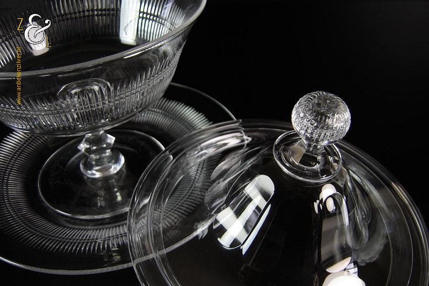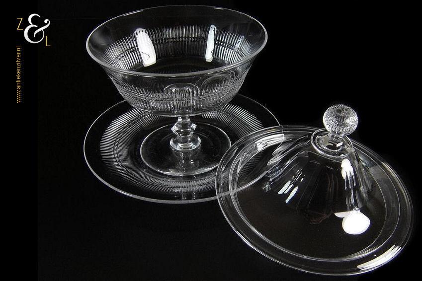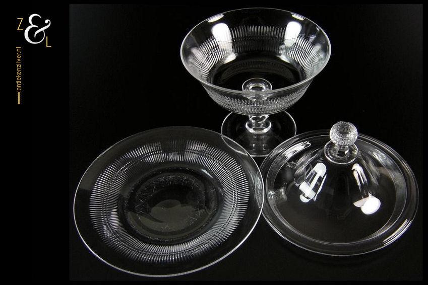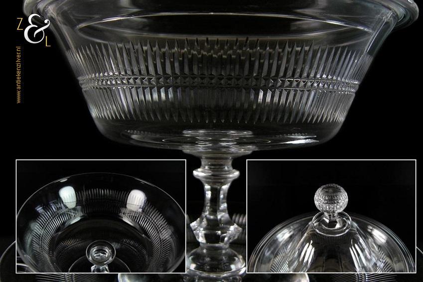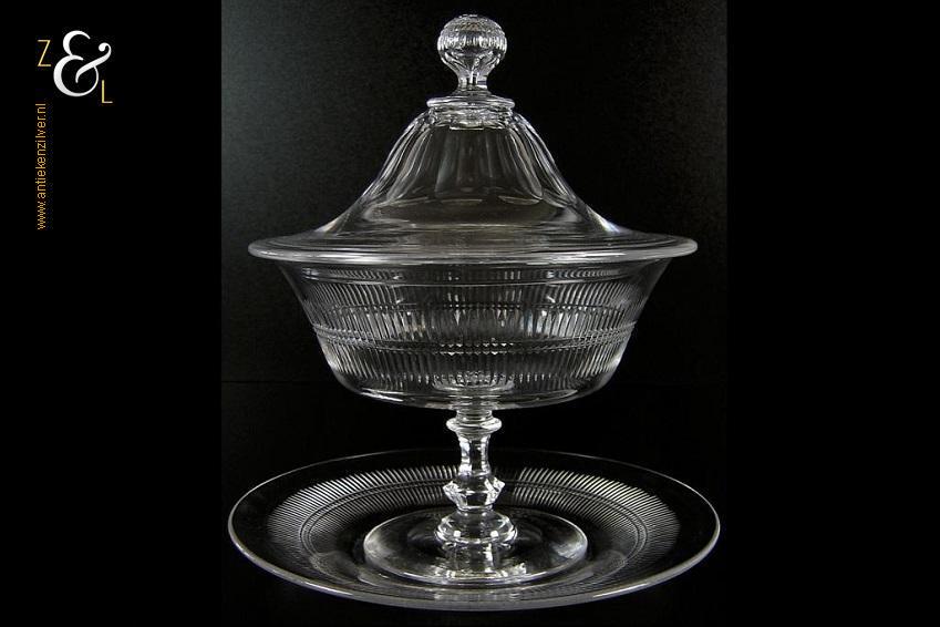 Deze Hollandse kristallen bonbonnière / drageoir / gembercoupe met schotel stamt uit de 1e helft van de 20e eeuw (rond 1920) de Art Deco periode. De bonbonnière / drageoir / gembercoupe is mondgeblazen, gepolijst en handgeslepen in een verticaal en horizontaal patroon en heeft een gefacetteerde balustervormige stam. De bonbonnière / drageoir / gembercoupe weegt 980 gram en heeft een hoogte 21 cm en een diameter van 19 cm.