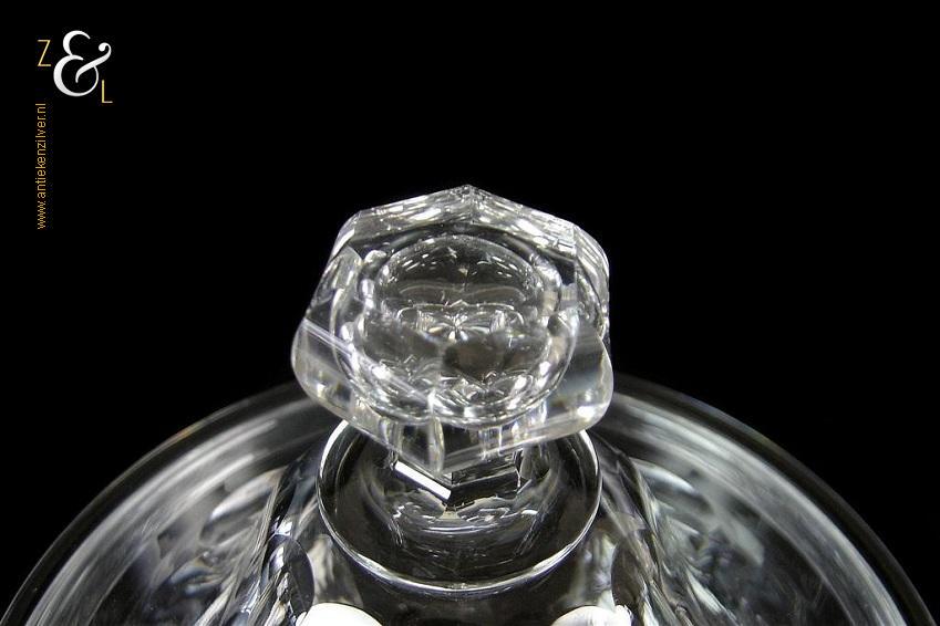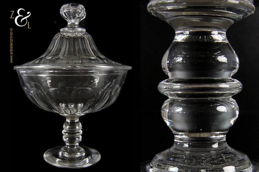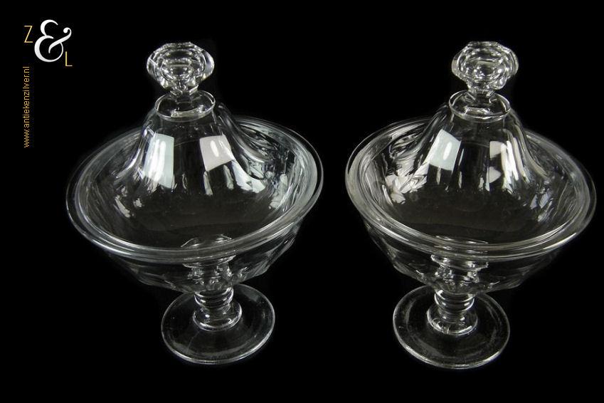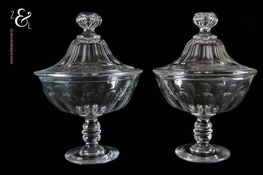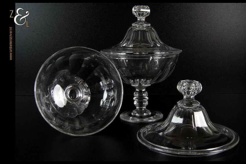 Dit stel royale kristallen bonbonnières / drageoirs / gembercoupes uit de 2e helft van de 19e eeuw (omstreeks 1880) de Biedermeier periode zijn mondgeblazen, gepolijst en handgeslepen. De balustervormige stammen zijn uitgevoerd met twee knopen met daartussen een schijf. Ze wegen samen 1920 gram en zijn 22.5 cm hoog en hebben een diameter van 17 cm. De krasjes onder de voeten zijn gebruikssporen die inherent zijn bij antiek kristal door jarenlang gebruik.