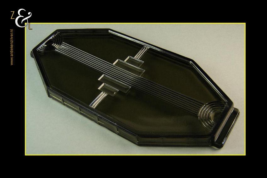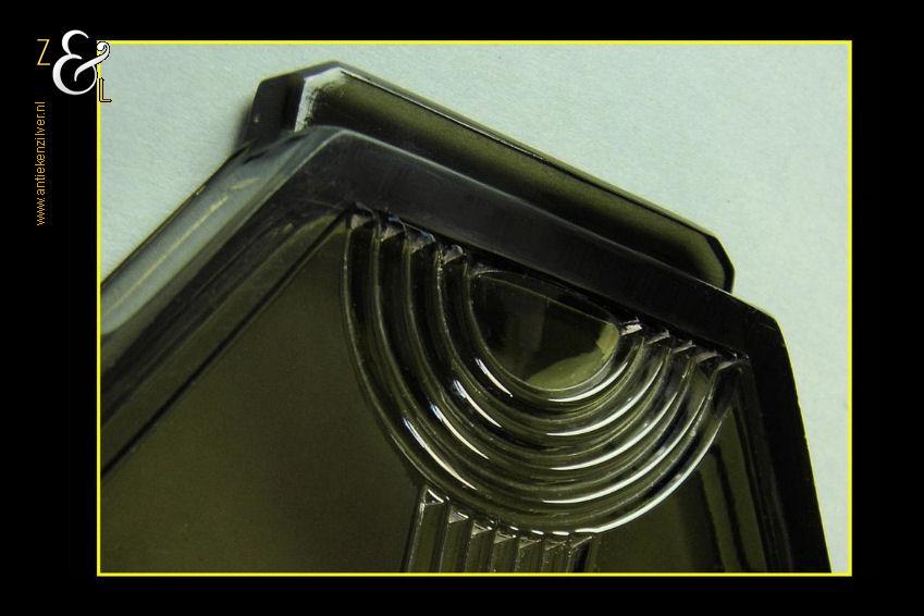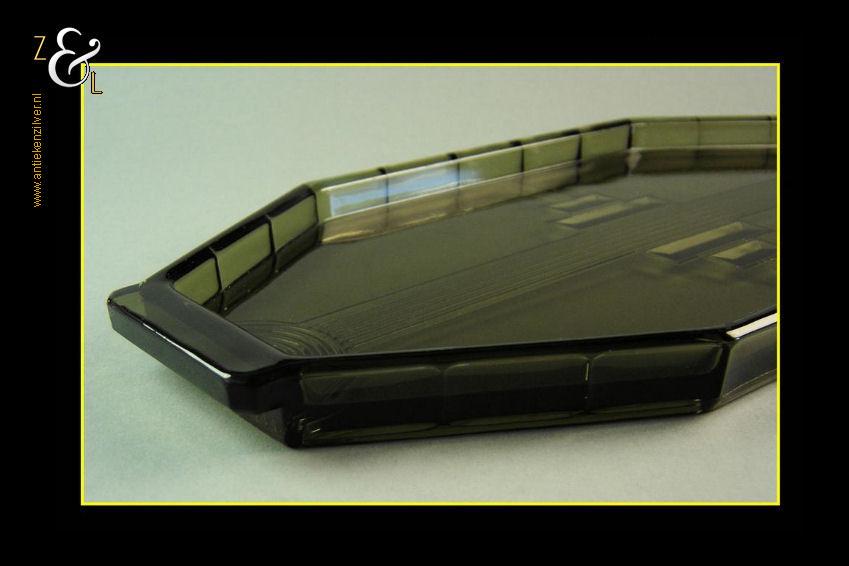 Dit in persglas uitgevoerde geometrisch gestileerde antiekgroene Art Deco dienblad is tussen 1930 en 1936 gemaakt in België bij Luxval. Luxval was een apart onderdeel van de wereldberoemde Val Saint Lambert glasfabrieken en opgericht om de economisch moeilijke periode na de eerste wereldoorlog (de dertiger en veertiger jaren) door te komen. Het dure mondgeblazen en handgeslepen kristal werd in die tijd slecht verkocht en het hoogwaardige maar veel goedkopere Luxval persglas moest als vervanger hiervan dienen. Voor Luxval werd een aantal ontwerpers aangetrokken waaronder Charles Graffart en René Delvenne die ook het hierboven aangeboden dienblad hebben ontworpen. Het persglazen dienblad weegt 896 gram is 34.5 cm lang 15.9 cm breed en 2 cm hoog.