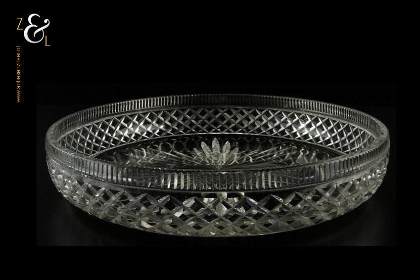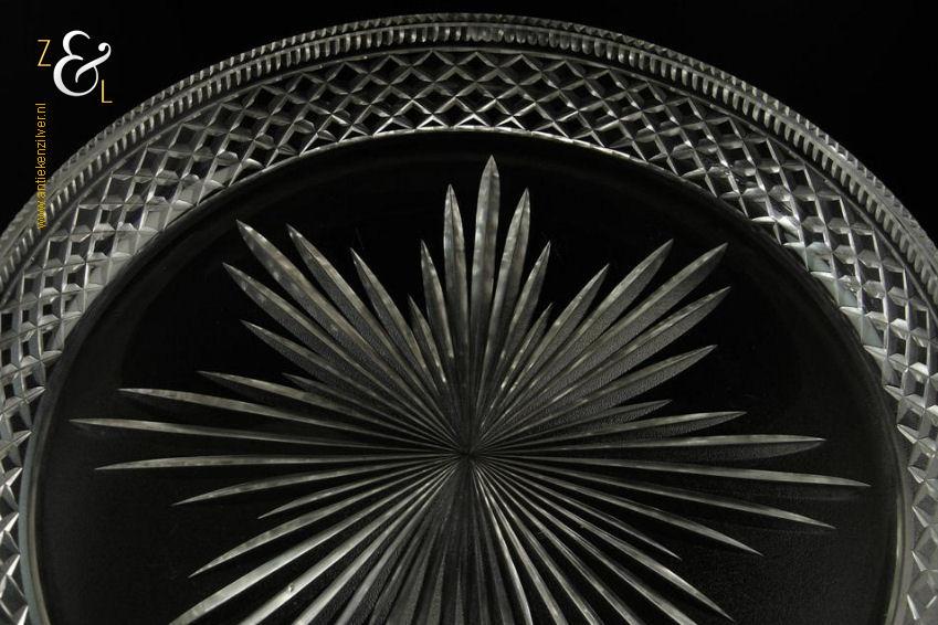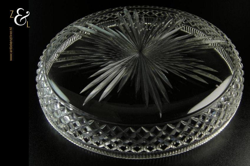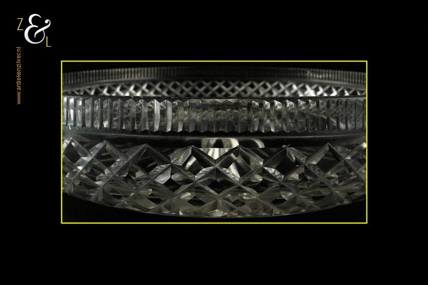 Deze antieke kristallen Hollandse schaal stamt uit het einde van de 19e eeuw (rond 1880). De schaal is mondgeblazen en handgeslepen. De zijkant is uitgevoerd in ruitslijpsel en heeft een verticaal slijpsel langs de rand. De bodem heeft een geslepen ster. Het gewicht van deze schaal is 1693 gram is 5 cm hoog en heeft een diameter van 27.5 cm.