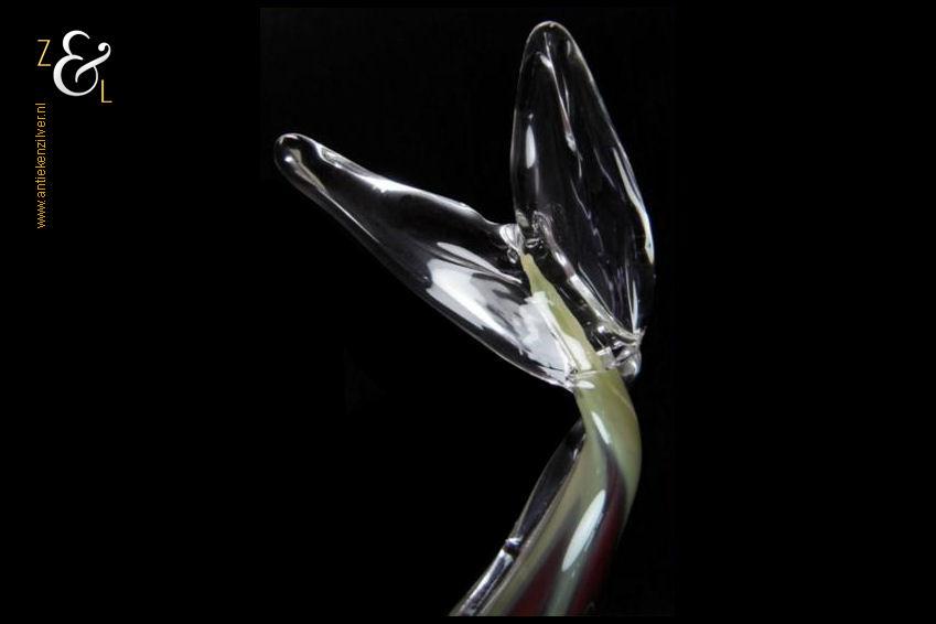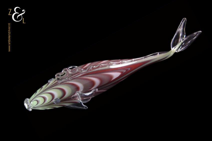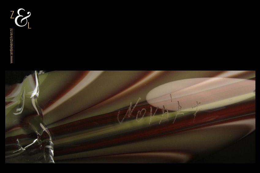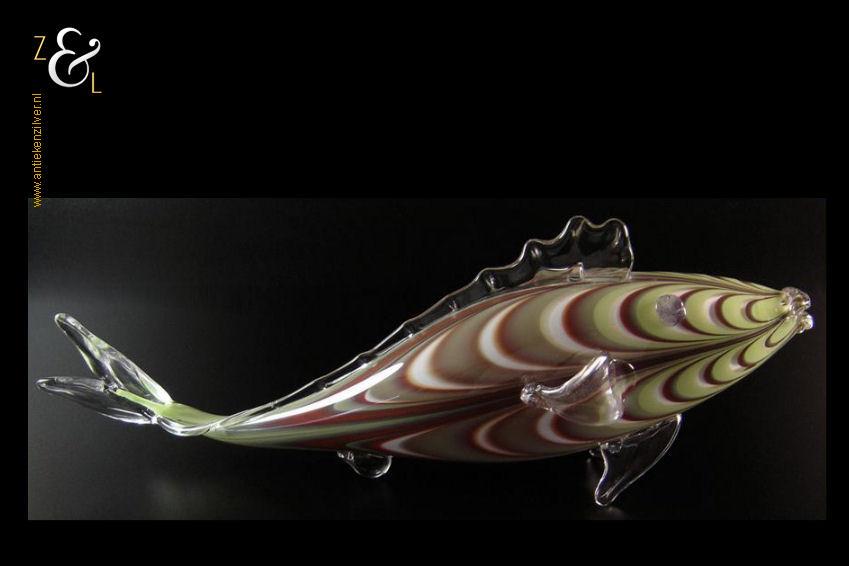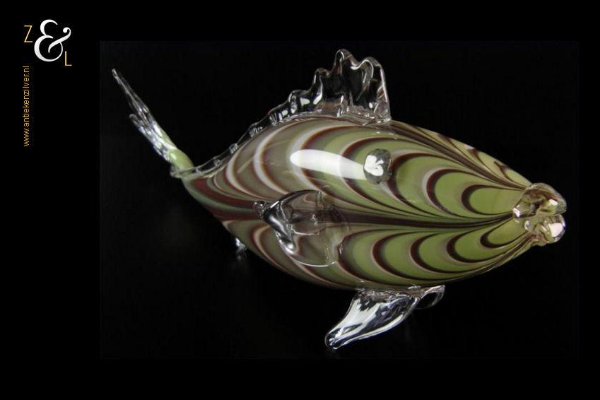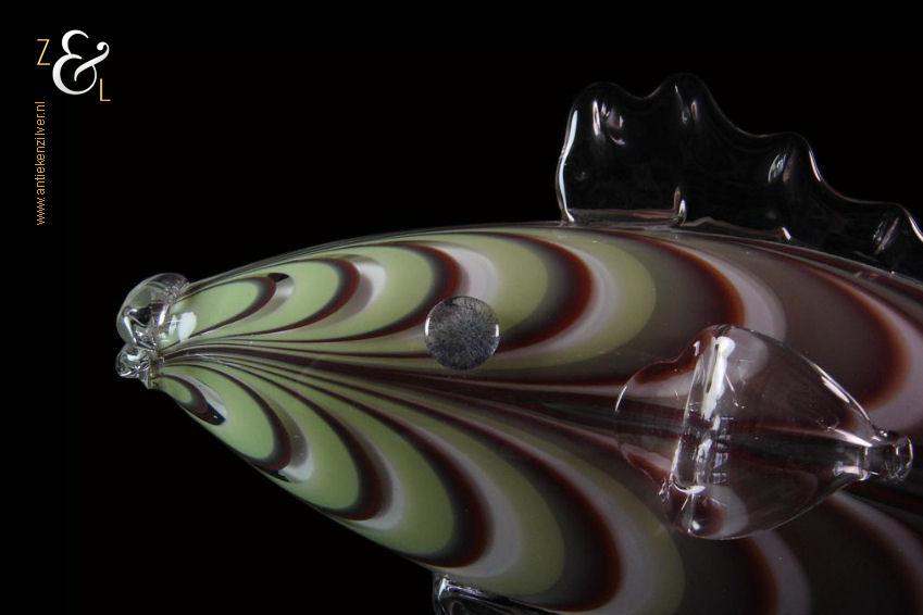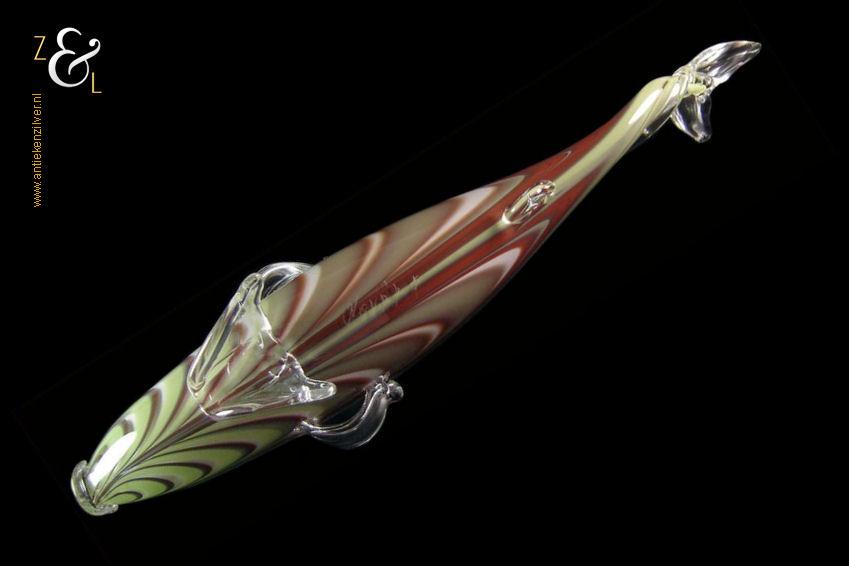 Deze grote glazen vis stamt uit Frankrijk waar hij in de 20e eeuw mondgeblazen en handgevormd is. De vis is uitgevoerd in groen, wit en bruinrood glas en heeft in transparant glas uitgevoerde staart en vinnen. De vis die aan de onderzijde gesigneerd is met Nova’r F heeft een lengte van 47 cm is 10 cm breed en 16.5 cm hoog hij weegt 1180 gram.