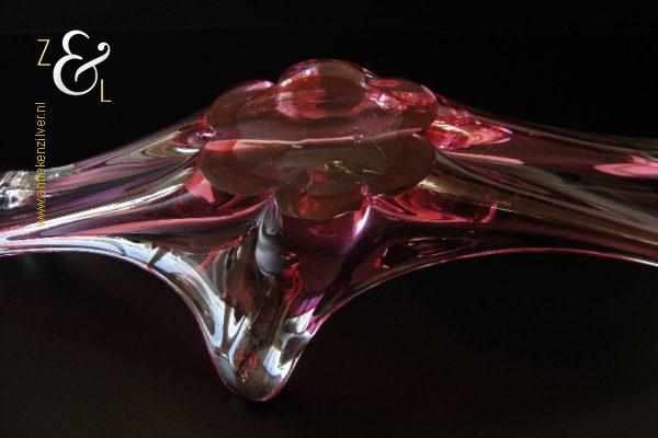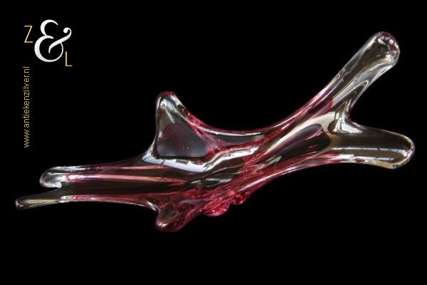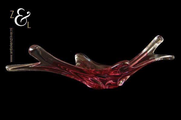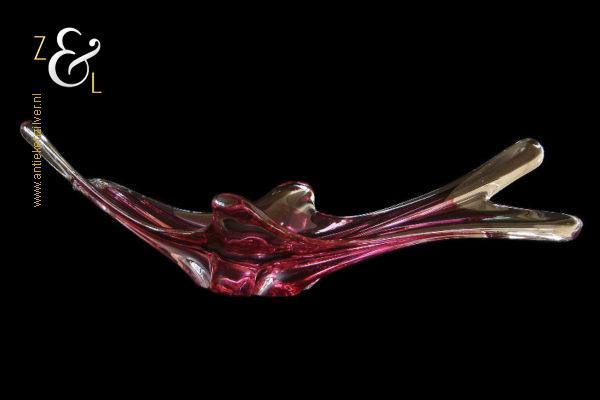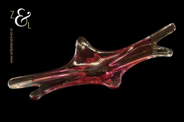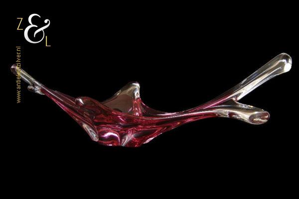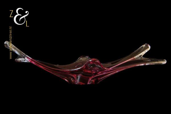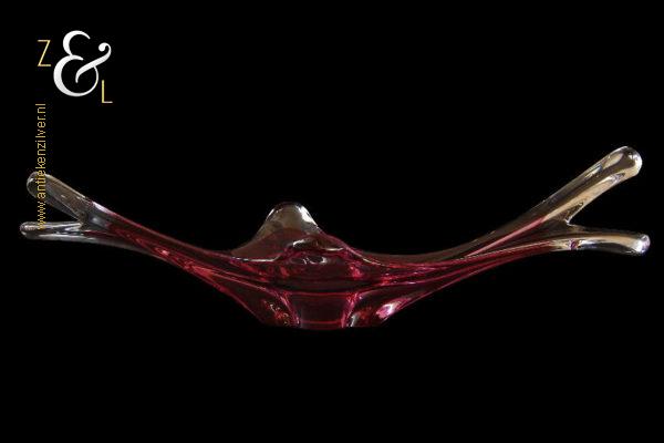 Deze in transparant en rood kleurig glas uitgevoerde schaal / fruitschaal is gemaakt in Venetië Italië op het eiland Murano. De dikwandige schaal / fruitschaal die mondgeblazen en handgevormd is stamt uit de zestiger / zeventiger jaren. De schaal / fruitschaal weegt 3646 gram is 61 cm lang 20.4 cm breed en 16 cm hoog.