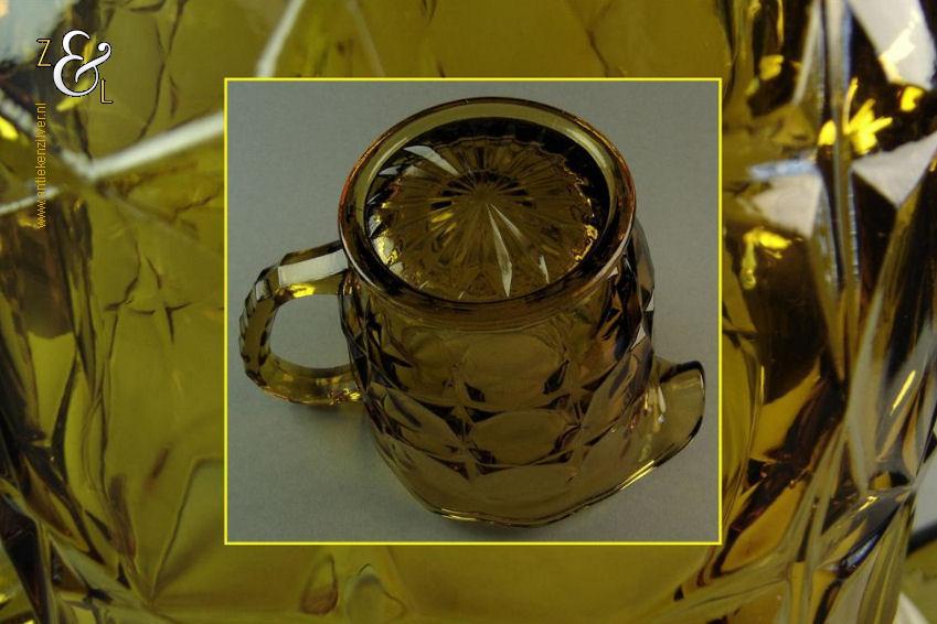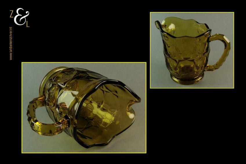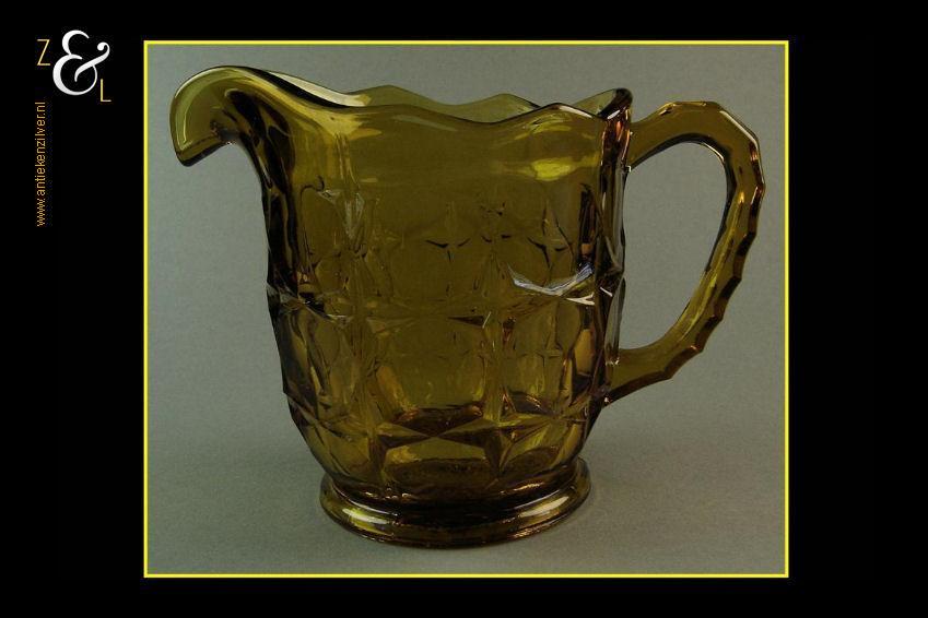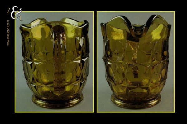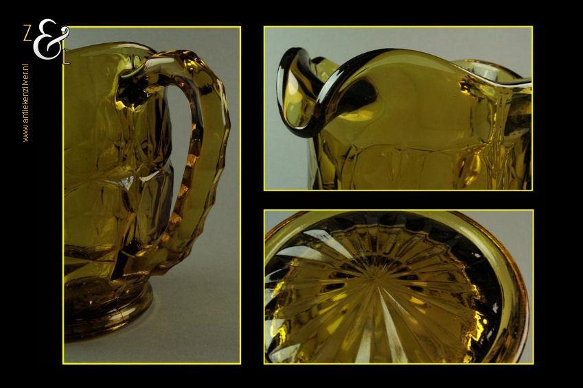 Deze persglazen amberkleurige schenkkan / waterkan is gemaakt in Engeland en stamt uit het einde van de 19e en het begin van de 20e eeuw. De schenkkan / waterkan heeft een inhoud van 0.8 liter weegt 1200 gram is 15.5 cm hoog en heeft een diameter van 12.4 cm. De voet heeft een diameter van 9.8 cm.