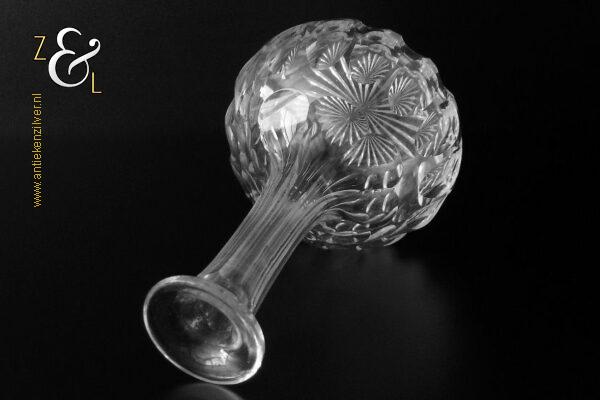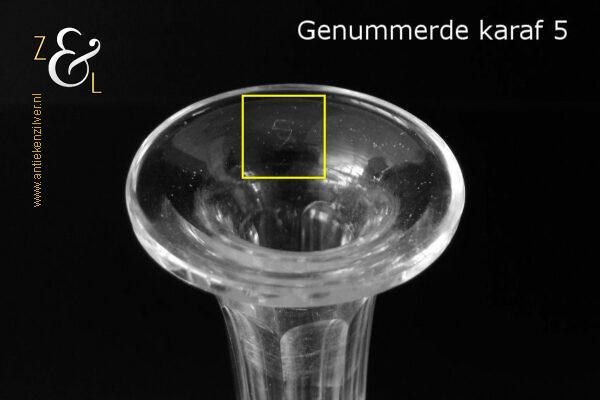 Deze Hollandse kristallen karaf (zonder stop) stamt uit de tweede helft van de 19e eeuw (omstreeks 1860). De mondgeblazen, op de hand geslepen en gepolijste karaf heeft een hals met acht ribben, op de buik een dubbele rij van zestien olijven en een ster aan de onderzijde. De zware karaf weegt 1131 gram is 22.9 cm hoog en heeft een diameter van 14 cm. De karaf is genummerd met nummer 5*. De karaf heeft aan de binnenzijde onderin aanslag (zie afbeeldingen).