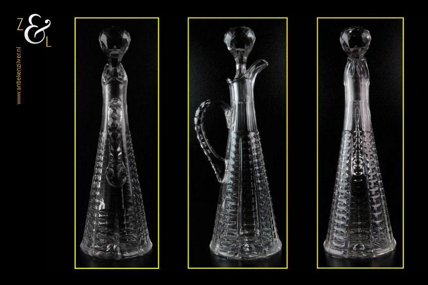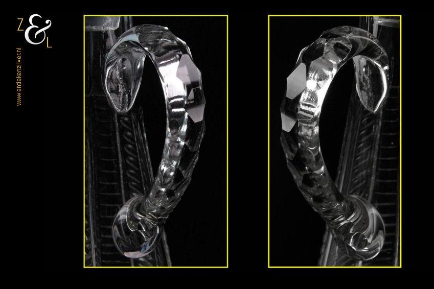 Deze Hollandse kristallen karaf met oor stamt uit het einde van de 19e eeuw is mondgeblazen en op de hand geslepen met olijven en een ster aan de onderzijde. De karaf weegt 900 gram heeft een diameter van 11 cm en is 33.5 cm hoog. Aan de onderzijde van de stop zitten een paar kleine chipjes zie foto.