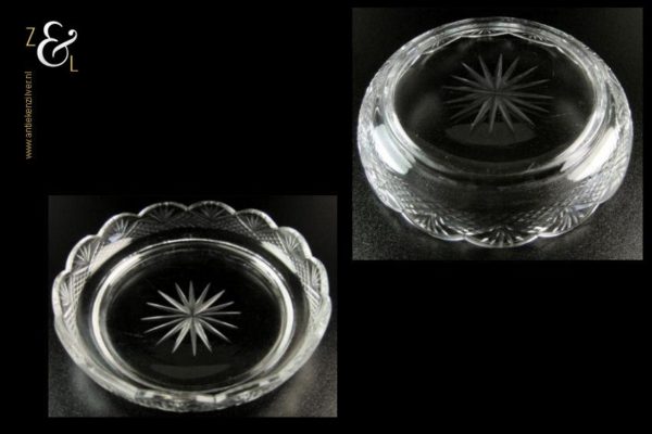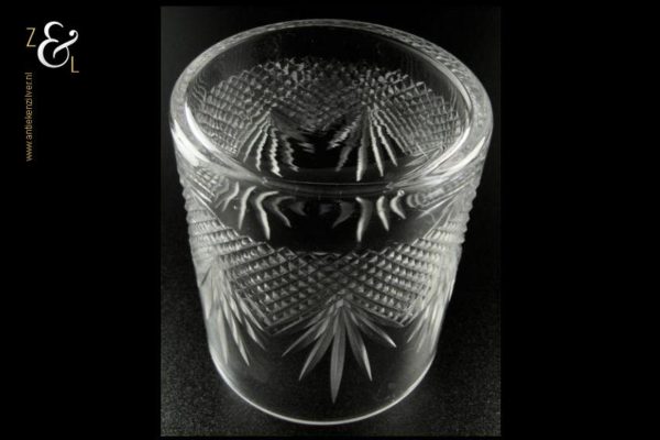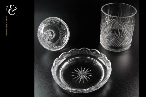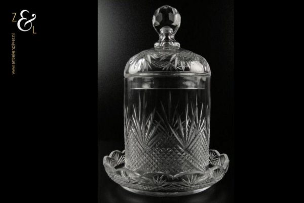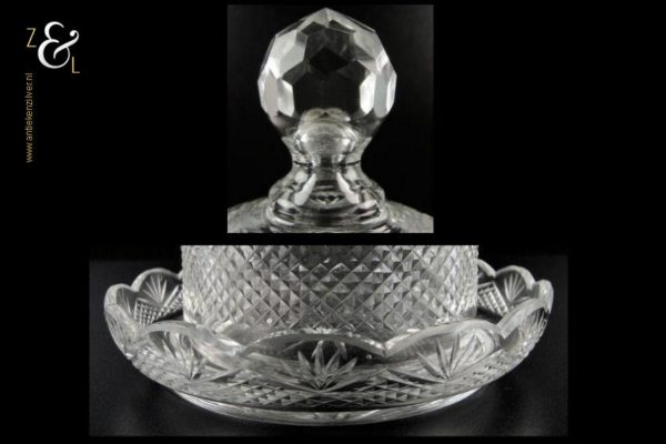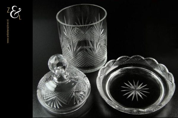 Deze driedelige in Art Deco stijl uitgevoerde Hollandse koekbus / beschuitbus is gemaakt omstreeks het einde van de 19e en het begin van de 20e eeuw. De kristallen deksel, schotel en bus zijn mondgeblazen gepolijst en geslepen. De schotel heeft een op de hand geslepen geschulpte rand met ruit en waaier motief en aan de onderzijde een geslepen ster. De bus en deksel zijn tevens met het ruit en waaier motief geslepen waarbij de deksel voorzien is van een gefacetteerde knop. De koekbus / beschuitbus weegt 1265 gram en is in totaal 24.5 cm hoog. De schotel heeft een diameter van 17.3 cm. De deksel heeft een diameter van 11.5 cm en is inclusief knop 11.5 cm hoog. De bus heeft een diameter van 11.5 cm en is 13.3 cm hoog.