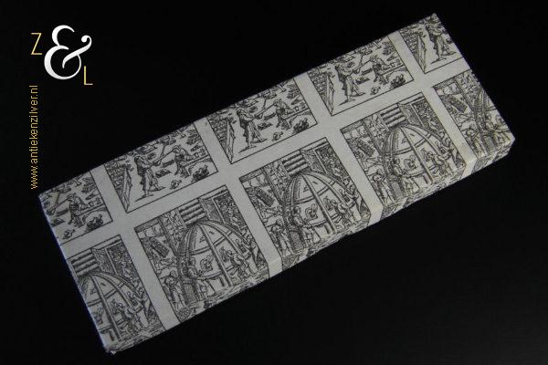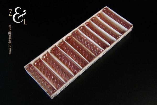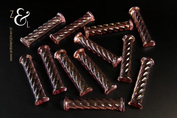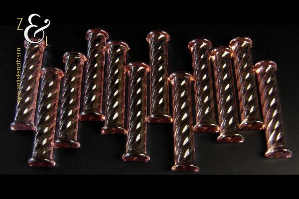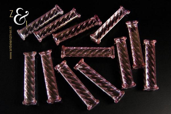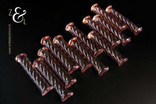 Deze twaalf messenleggers zijn gemaakt in Hongarije en stammen uit de zeventiger jaren. De rosé kleurige glazen messenleggers die in een getordeerd model zijn uitgevoerd wegen samen met de cassette 525 gram en zijn 8.7 cm lang bij 2.2 cm breed bij 1.8 cm hoog, de cassette is 27 cm lang bij 9.5 cm breed bij 2.3 cm hoog.