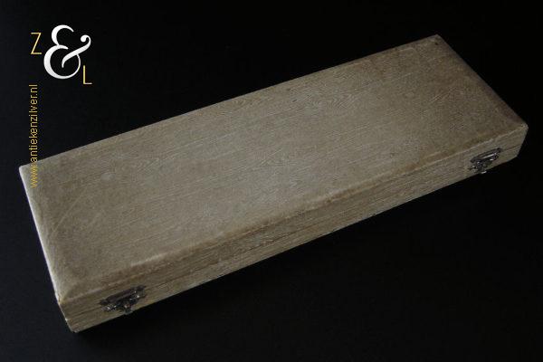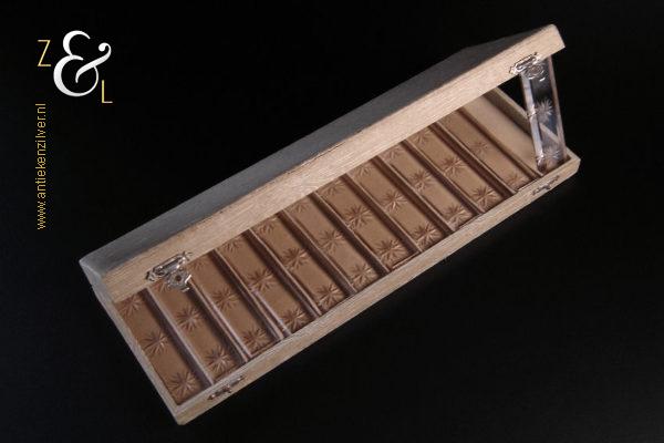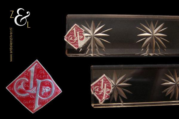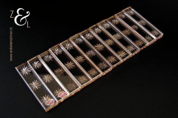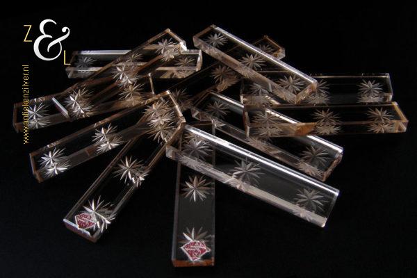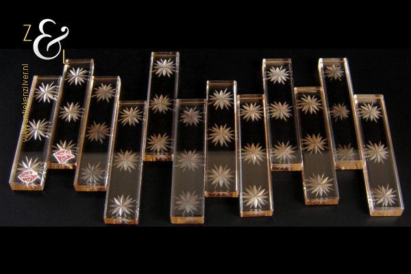 Deze twaalf messenleggers zijn gemaakt in Nederland bij de glasfabriek JP glas en stammen uit de Art Deco periode (omstreeks 1920). De rosé kleurige kristallen messenleggers die in een rechthoekig model zijn uitgevoerd zijn rondom op de hand facet geslepen en aan de onderzijde voorzien van drie geslepen sterren. De twaalf messenleggers wegen samen met het foedraal 654 gram en zijn 9 cm lang bij 2 cm breed bij 0.9 cm hoog, het foedraal is 29.5 cm lang bij 10 cm breed bij 3 cm hoog.