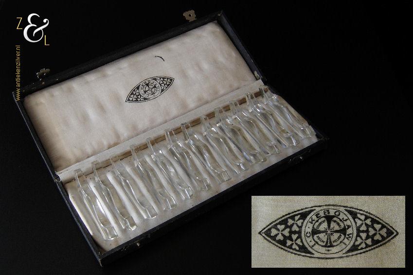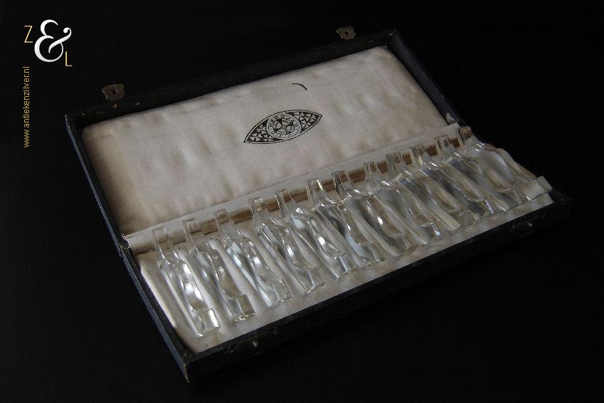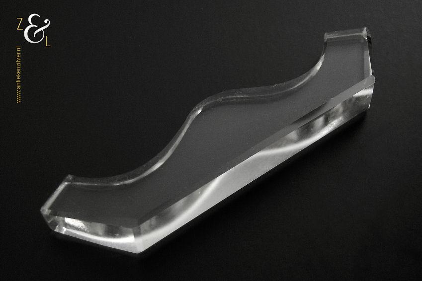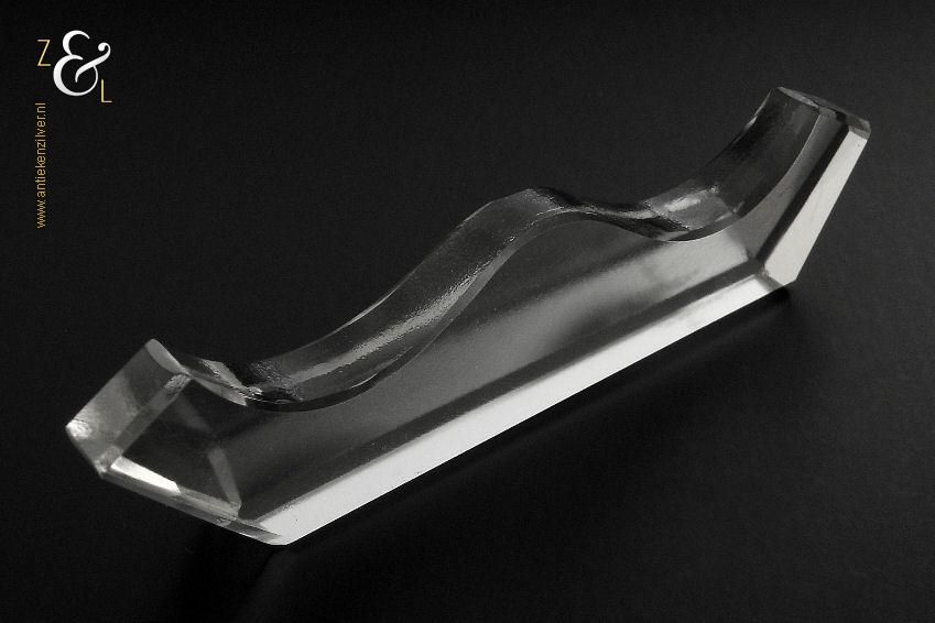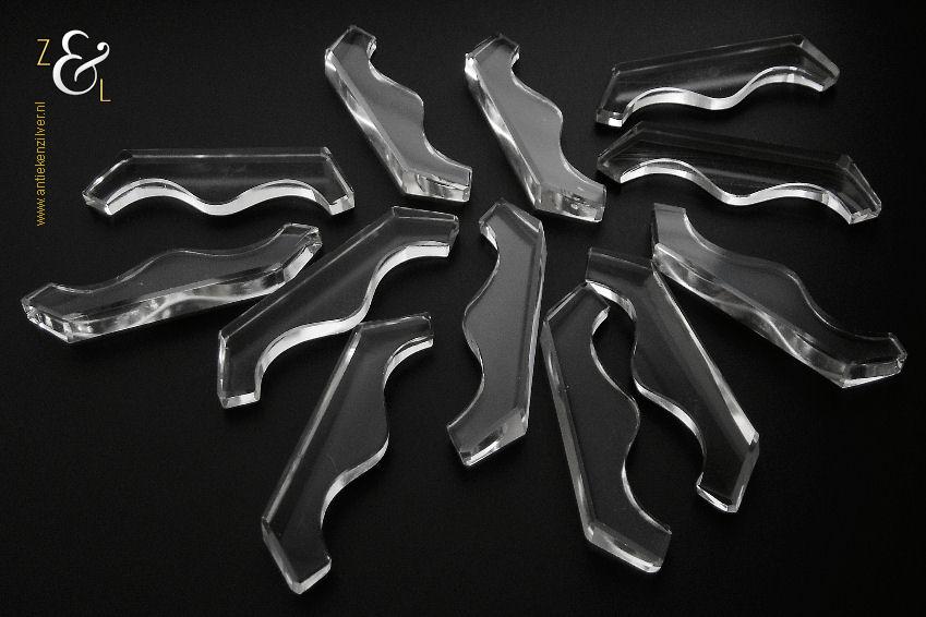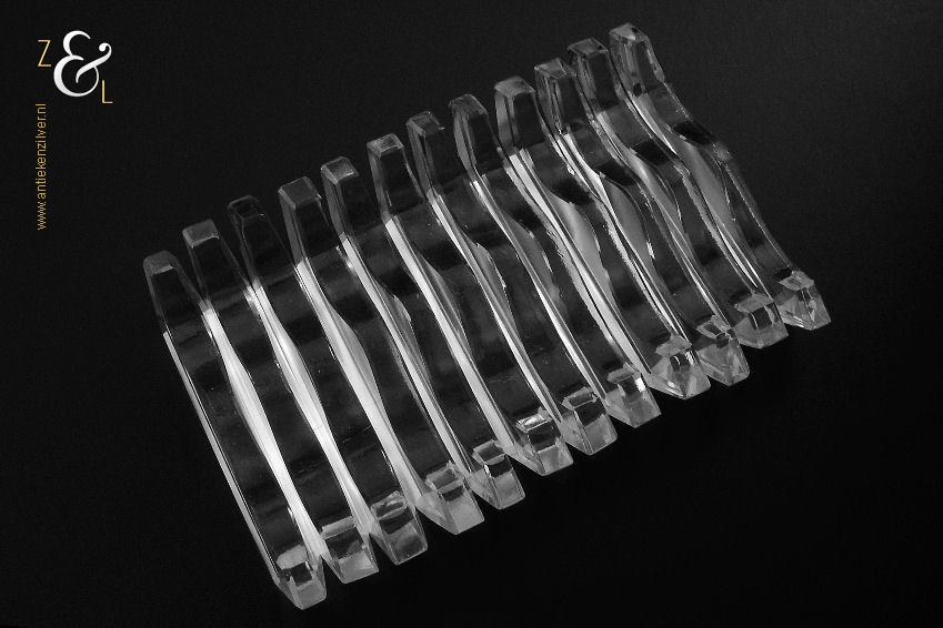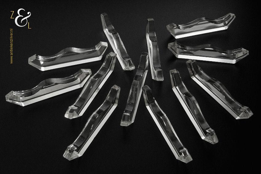 Deze twaalf messenleggers zijn verkocht door de Firma I.C. Kebojawi en stammen uit de Art Deco periode (omstreeks 1920). De in helder kristal uitgevoerde messenleggers zijn rondom op de hand facet geslepen, gepolijst en gevormd in een gegolfd model. De messenleggers hebben schuin oplopende hoekige uiteinden en in het midden een bolle vorm waardoor er twee punten ontstaan waar men een mes kan leggen. De twaalf messenleggers wegen samen met het foedraal 619 gram en zijn 8.8 cm lang bij 1.1 cm breed bij 2.1 cm hoog, het foedraal is 27 cm lang bij 10.6 cm breed bij 3.6 cm hoog. De messenleggers en het foedraal hebben gebruikssporen.