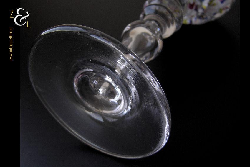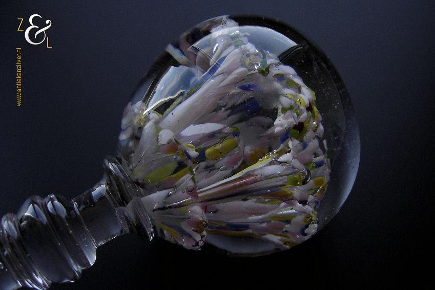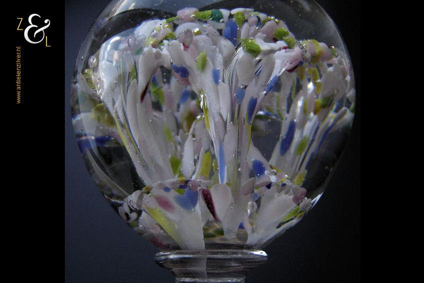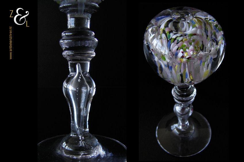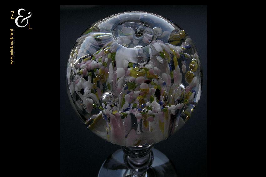 Deze pruikenstandaard is gemaakt in België of Frankrijk en stamt uit de 19e eeuw. De helderglazen pruikenstandaard heeft een balustervormige steel met luchtbel en de bol heeft veelkleurige bloemkelken met ingestoken luchtbellen. De pruikenstandaard weegt 901 gram en is 20.5 cm hoog. De bol heeft een diameter van 7.8 cm en de voet heeft een diameter van 8.5 cm. De zijkant van de bol en de rand van de voet hebben een klein ruw plekje, hier heeft de pruikenstandaard tijdens het afkoelen in de koeloven op gelegen.