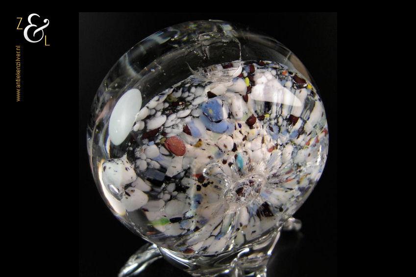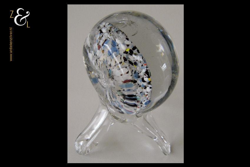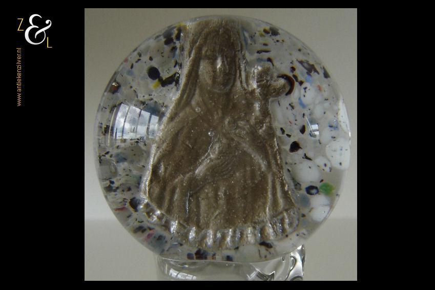Deze presse papier met drie glazen poten is gemaakt in België bij de glasblazerij Val Saint Lambert en stamt uit de 19e eeuw. De presse papier heeft een religieuze voorstelling gemaakt van zilver- of aluminiumfolie dat opgesloten zit in het glas. Aan de achter- en bovenkant van deze presse papier zit een pontil merk* en de achtergrond is gedecoreerd met een veelkleurig stippen / confettipatroon. De presse papier heeft een hoogte van 13.8 cm, de glazen bol heeft een diameter van 8.2 cm en hij weegt 772 gram.