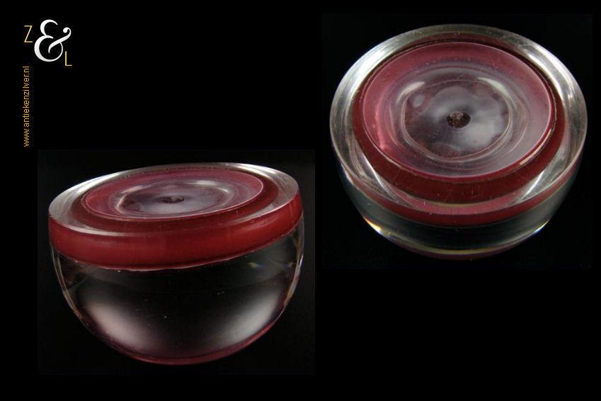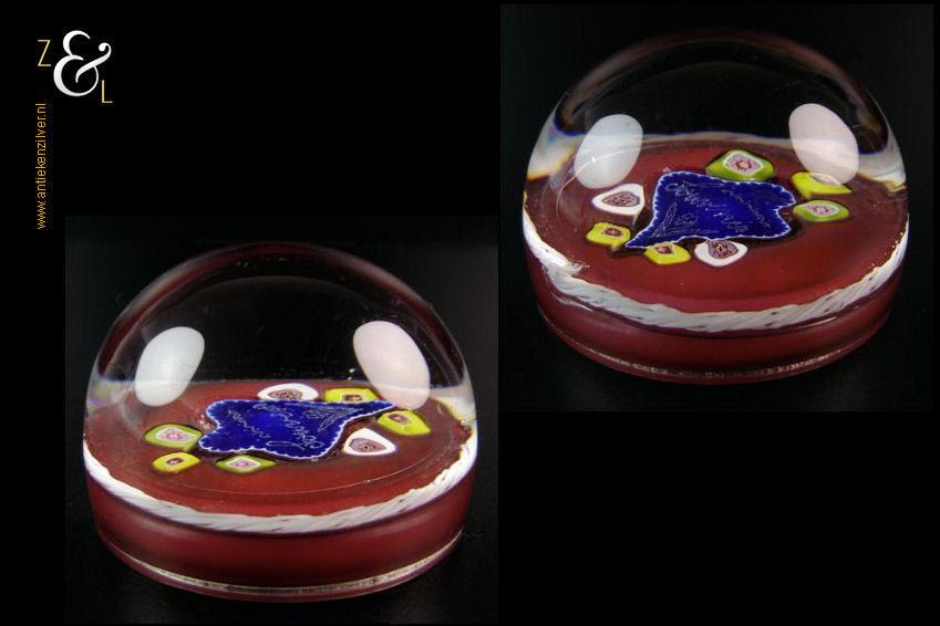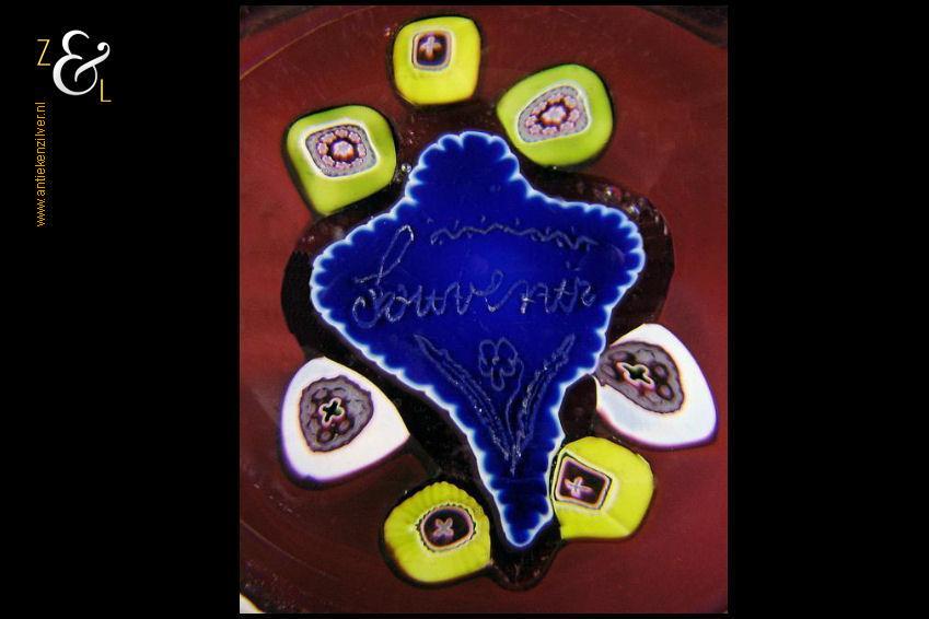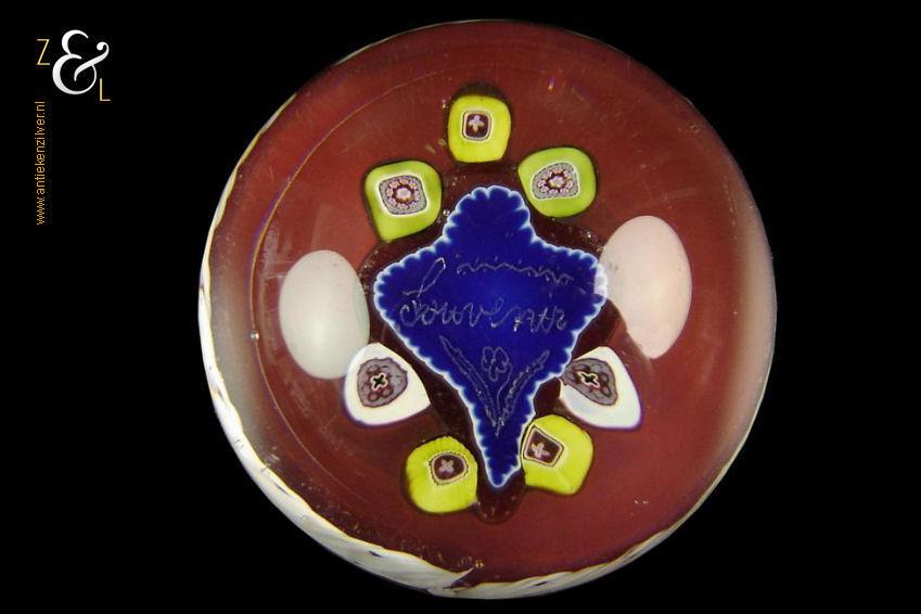 Deze presse papier is gemaakt in België bij de glasblazerij Val Saint Lambert en stamt uit de 19e eeuw. In het midden van de presse papier staat op een blauwe achtergrond het woord Souvenir geschreven. Daaromheen zijn zeven stukjes millefiori* gebruikt. De presse papier heeft een rode achtergrond met rondom een witte kabel. De presse papier heeft een hoogte van 6 cm een diameter van 8.5 cm en hij weegt 896 gram.
