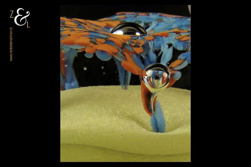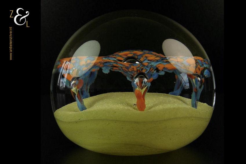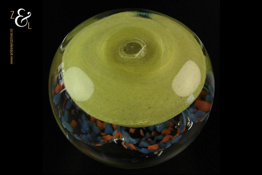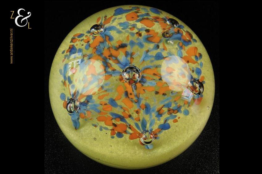 Deze helder glazen presse papier met zes ingestoken luchtbellen gele onderkant en blauw oranje bloemvormen is in de 20e eeuw gemaakt in Engeland. De presse papier weegt 628 gram is 6.7 cm hoog en heeft een diameter van 7.8 cm. Aan de onderzijde zit een pontil merk*.