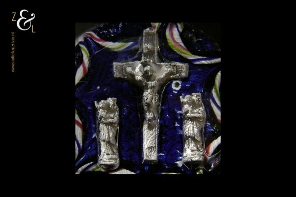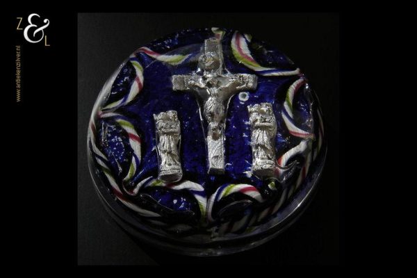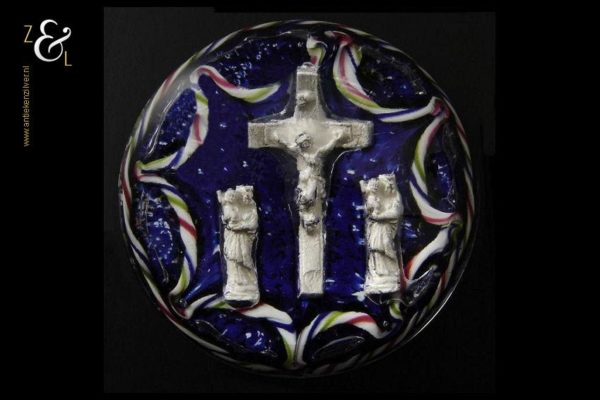 Deze presse papier is gemaakt in België bij de glasblazerij Val Saint Lambert en stamt uit de 19e eeuw. De presse papier heeft een religieuze voorstelling (gemaakt van zilver- of aluminiumfolie dat opgesloten zit in het glas) van een crucifix (Christus aan het kruis) en twee madonna figuren (Maria met kind) aan weerszijde. De helder glazen presse papier heeft een blauw met wit gestipte achtergrond en rondom een getordeerde kabelrand en guirlande uitgevoerd in de kleuren rood wit groen en blauw. De presse papier weegt 764 gram heeft een diameter van 9.8 cm en is 5.1 cm hoog.