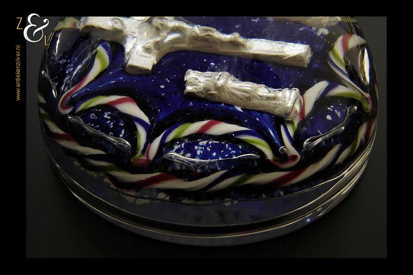 Deze presse papier is gemaakt in België bij de glasblazerij Val Saint Lambert en stamt uit de 19e eeuw. De presse papier heeft een religieuze voorstelling (gemaakt van zilver- of aluminiumfolie dat opgesloten zit in het glas) van een crucifix (Christus aan het kruis) en twee madonna figuren (Maria met kind) aan weerszijde. De helder glazen presse papier heeft een blauw met wit gestipte achtergrond en rondom een getordeerde kabelrand en guirlande uitgevoerd in de kleuren rood wit groen en blauw. De presse papier weegt 764 gram heeft een diameter van 9.8 cm en is 5.1 cm hoog.