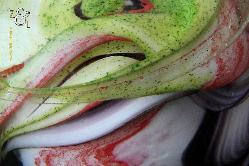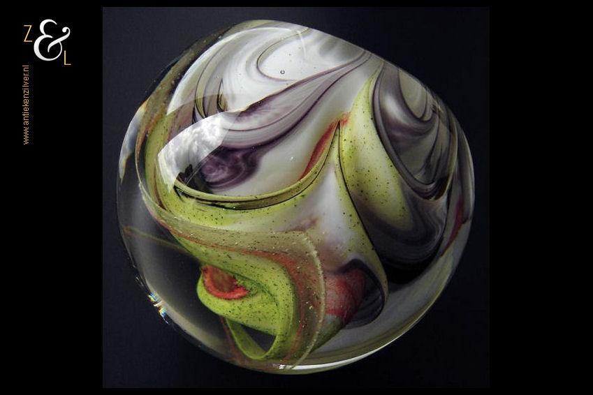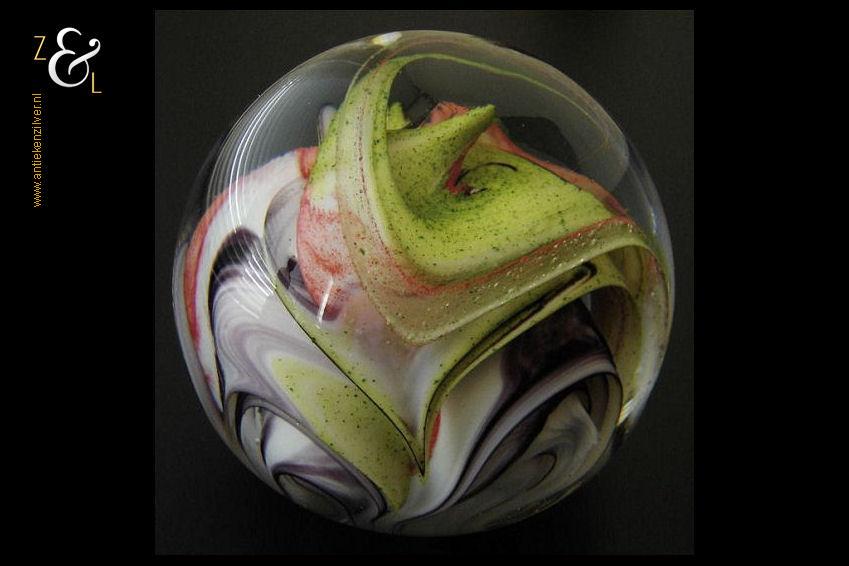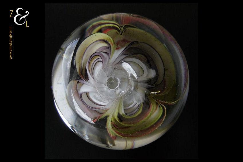 Deze aparte presse papier is gemaakt in België en stamt uit de 19e eeuw. De helder glazen presse papier is uitgevoerd in de kleuren wit paars groen en oranje en zo opgebouwd dat men tussen de gekleurde lagen heen kan kijken. Bij de groene kleur is een glinsterende oxide gebruikt. Aan de onderkant van deze presse papier zit een pontil merk* De presse papier heeft een diameter van 7.8 cm is 7.2 cm hoog en weegt 654 gram.