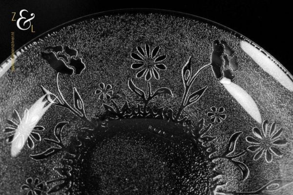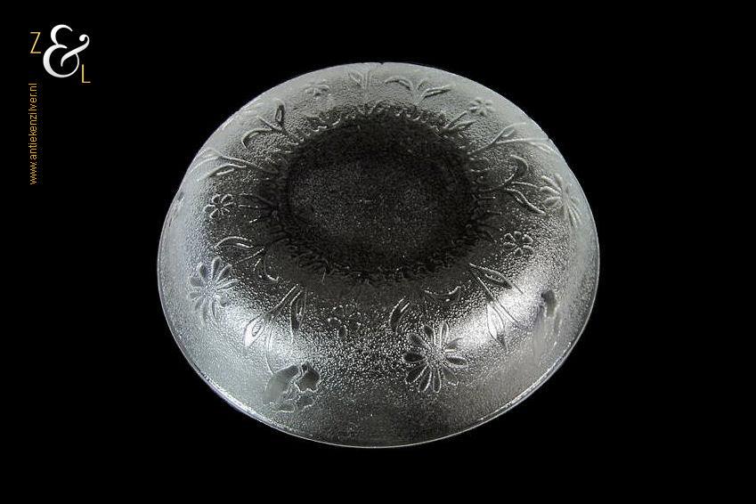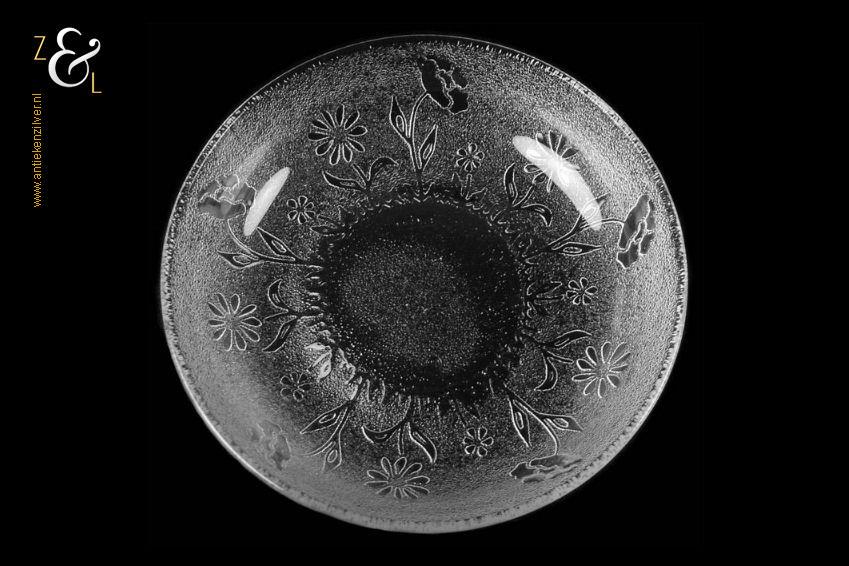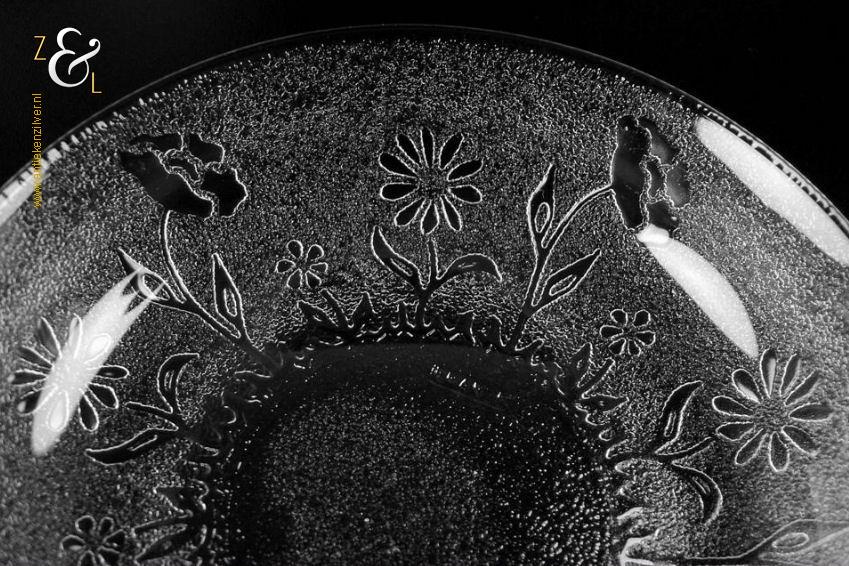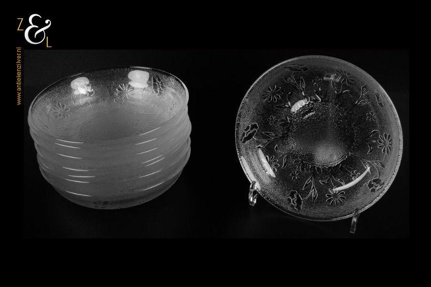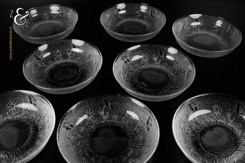 Deze set van acht persglazen schotels / schaaltjes zijn gemaakt in Frankrijk (Baccarat?) in de eerste helft van de 20e eeuw. De schotels / schaaltjes zijn gedecoreerd met bloemen en aan de onderzijde gesigneerd met France en een nummer. Samen wegen zij plusminus 1700 gram, hebben een diameter van 14.8 cm en zijn 3 cm hoog.