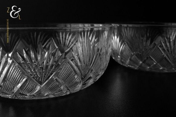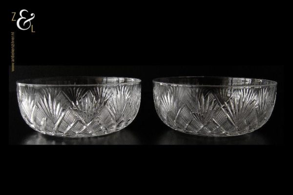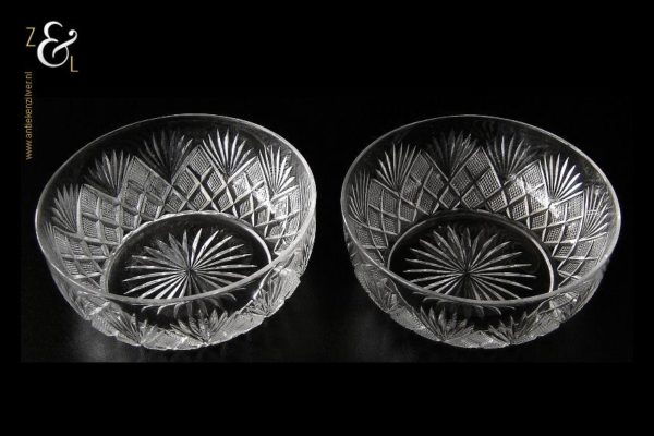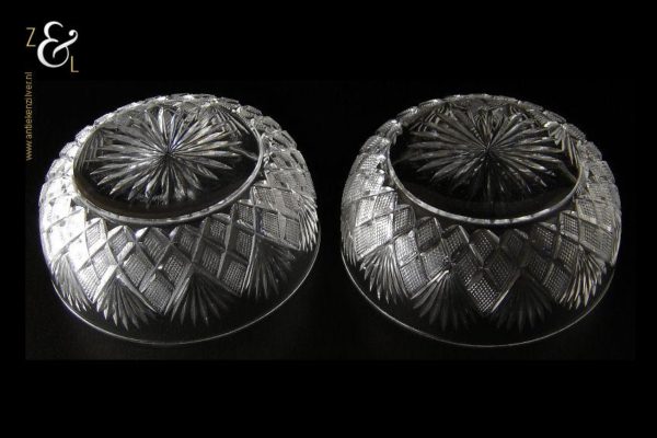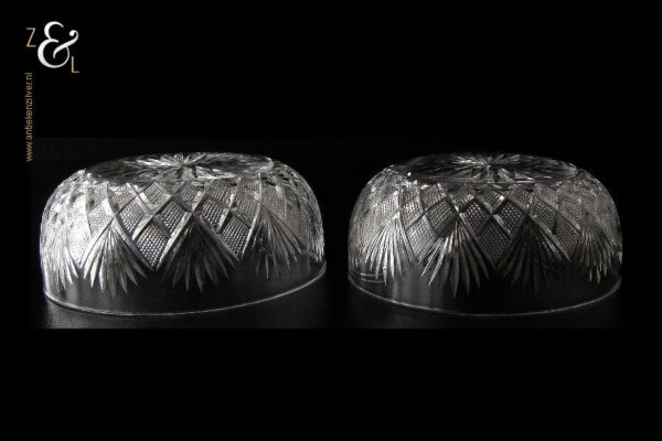 Dit stel in ruit en waaier geslepen vingerkommen is gemaakt in Nederland aan het einde van de negentiende begin twintigste eeuw. De mondgeblazen handgeslepen en gepolijste vingerkommen zijn uitgevoerd in ruit en waaier slijpsel en hebben aan de onderzijde een geslepen ster. De vingerkommen wegen samen 282 gram hebben een diameter van 11.4 cm en zijn 4.6 cm hoog.