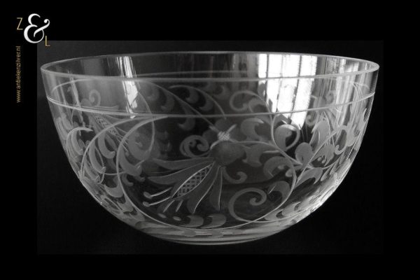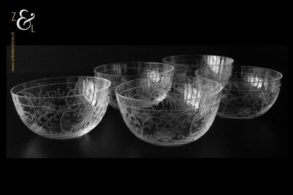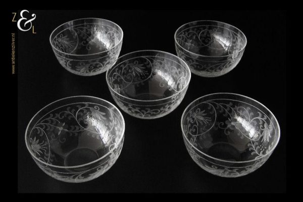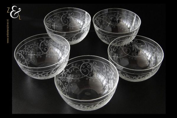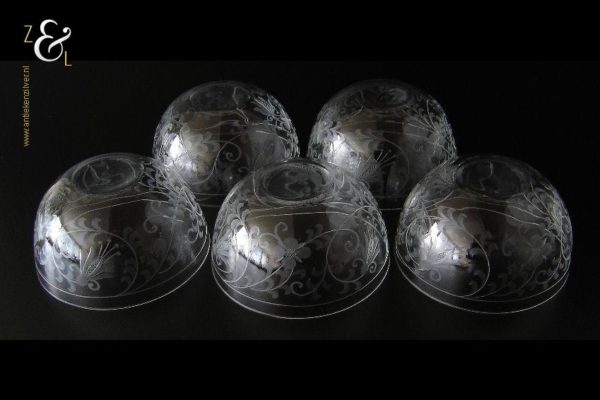 Deze vijf handgeslepen, gepolijste en geëtste kristallen vingerkommen zijn gemaakt in Nederland aan het einde van de negentiende begin twintigste eeuw. Doordat de vingerkommen handgemaakt en mondgeblazen zijn wijken de gewichten en afmetingen enigszins af (niet met het blote oog zichtbaar). De vingerkommen wegen samen 569 gram hebben een diameter van 11 cm en zijn 5.7 cm hoog.