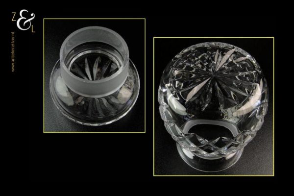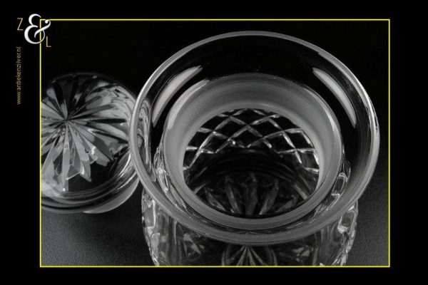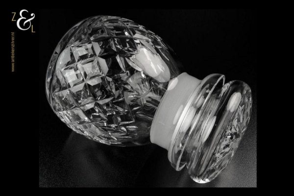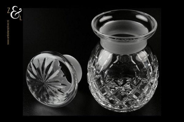 Deze ruit geslepen kristallen theebus is uitgevoerd met een geslepen ster op de stop en aan de onderzijde. De theebus is 14 cm hoog heeft een diameter van 9.5 cm en weegt 574 gram.