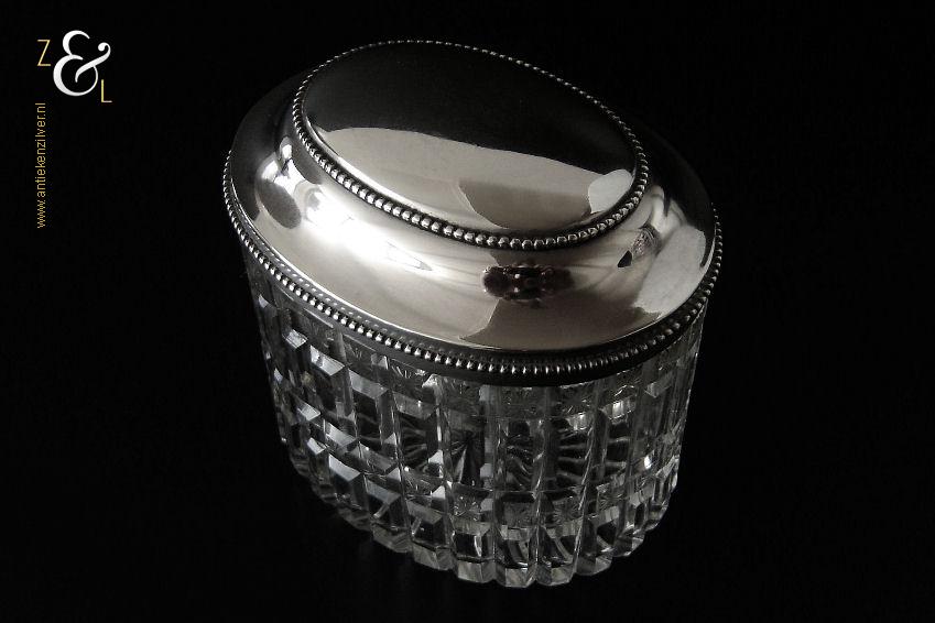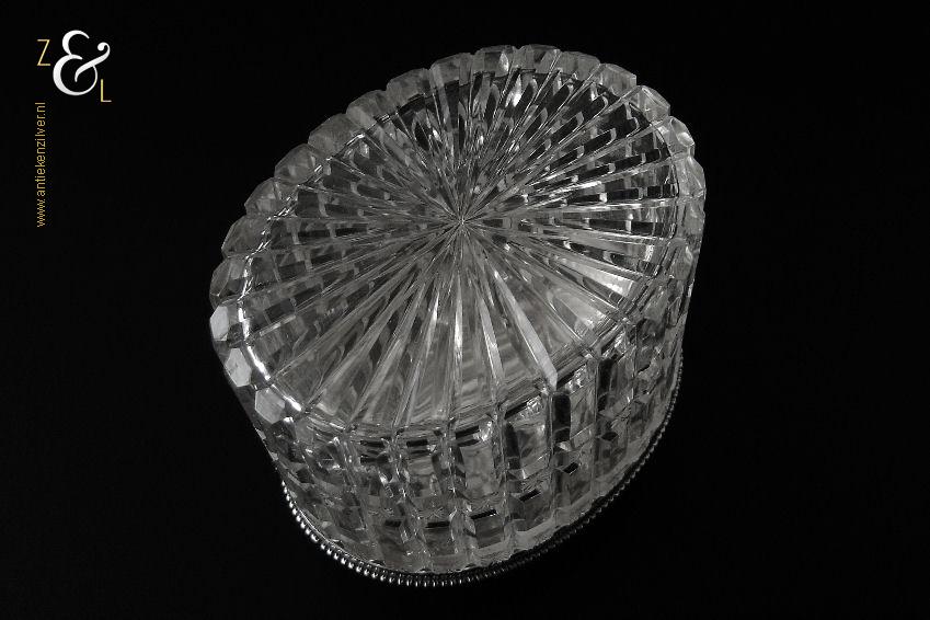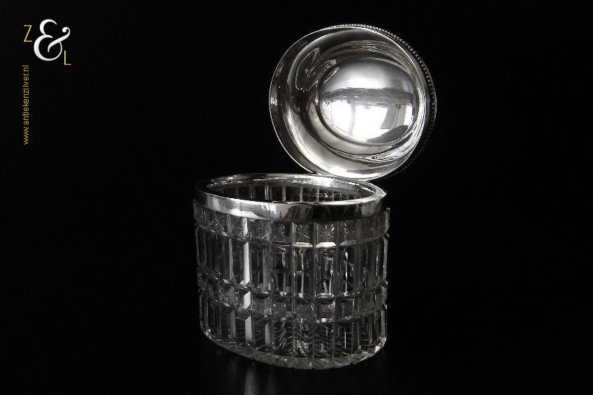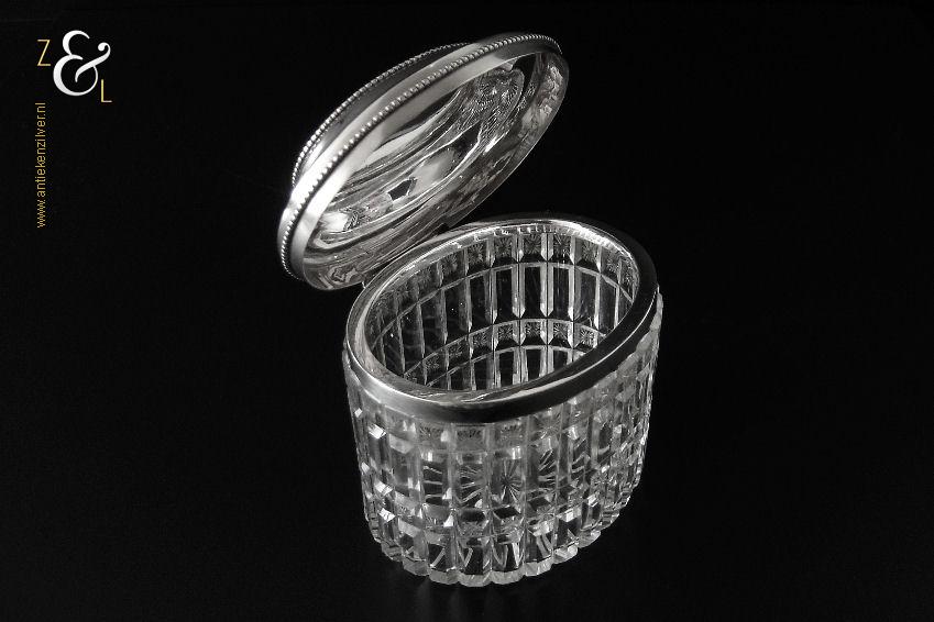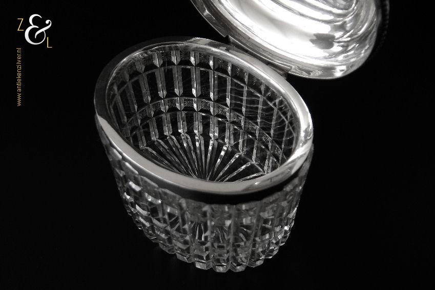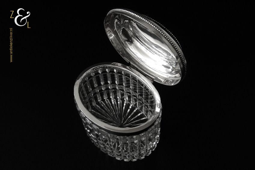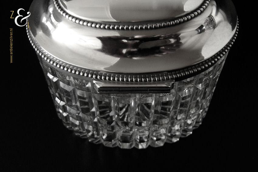 Van deze in Biedermeier stijl uitgevoerde theedoos is het zilveren deksel gemaakt in Amsterdam door Jan Hoogendoorn (meesterteken J3H in langwerpige zeshoek) tussen 1814 en 1819 gekeurd met het zilverkeur zwaardje (dit is het gehaltemerk voor kleine zilveren werken). Zowel de binnenzijde van het deksel als het montuur zijn voorzien van het meesterteken en het zilverkeur. Het zilveren deksel en montuur van deze ovale theedoos is scharnierend en is uitgevoerd met een parelrand. De mondgeblazen, handgeslepen en gepolijste kristallen doos heeft zowel horizontale als verticale geslepen ribben met rechthoeken en vierkanten waarin een ster geslepen is. De theedoos is aan de onderzijde geheel geslepen met een stervorm. De ovale theedoos weegt 361 gram is 10.8 cm lang bij 8.4 cm breed bij 9.7 cm hoog.