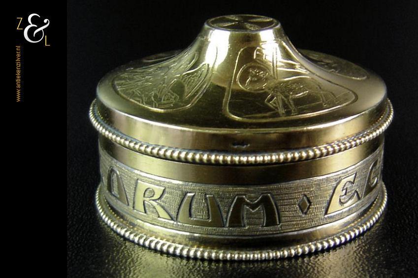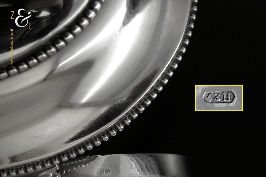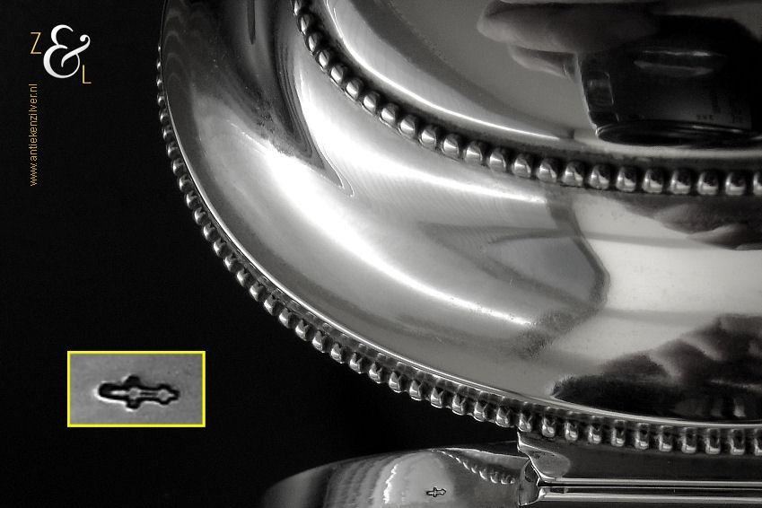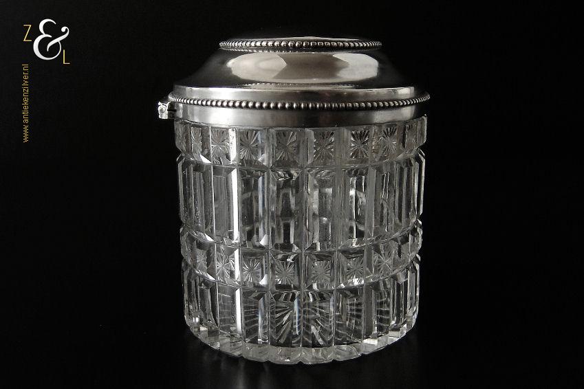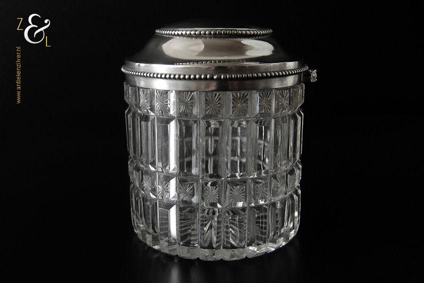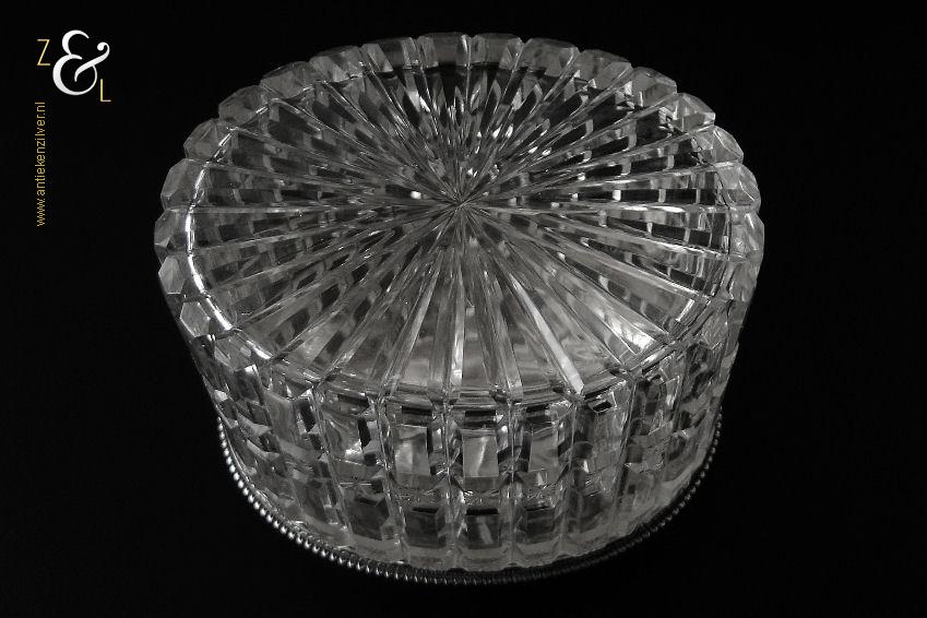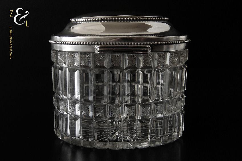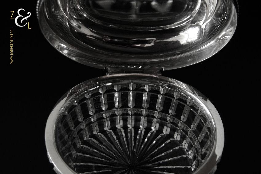 Van deze in Biedermeier stijl uitgevoerde theedoos is het zilveren deksel gemaakt in Amsterdam door Jan Hoogendoorn (meesterteken J3H in langwerpige zeshoek) tussen 1814 en 1819 gekeurd met het zilverkeur zwaardje (dit is het gehaltemerk voor kleine zilveren werken). Zowel de binnenzijde van het deksel als het montuur zijn voorzien van het meesterteken en het zilverkeur. Het zilveren deksel en montuur van deze ovale theedoos is scharnierend en is uitgevoerd met een parelrand. De mondgeblazen, handgeslepen en gepolijste kristallen doos heeft zowel horizontale als verticale geslepen ribben met rechthoeken en vierkanten waarin een ster geslepen is. De theedoos is aan de onderzijde geheel geslepen met een stervorm. De ovale theedoos weegt 361 gram is 10.8 cm lang bij 8.4 cm breed bij 9.7 cm hoog.