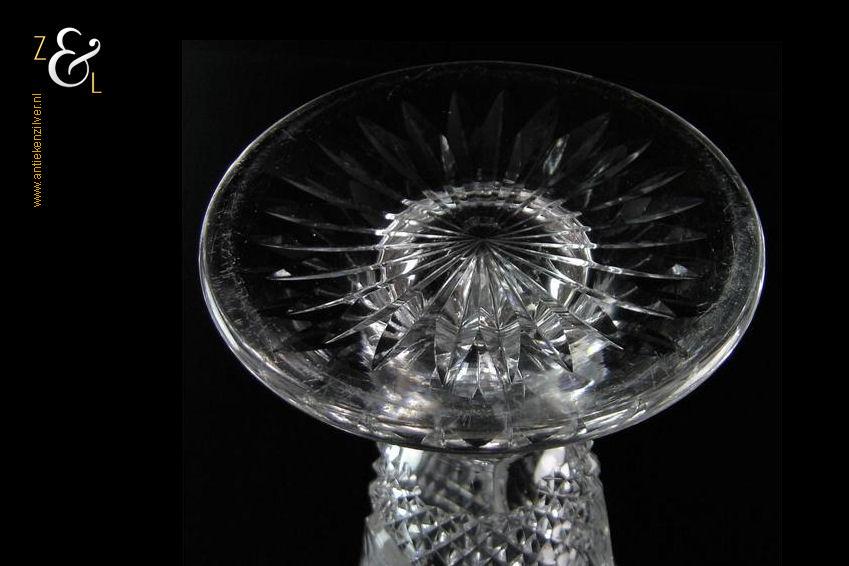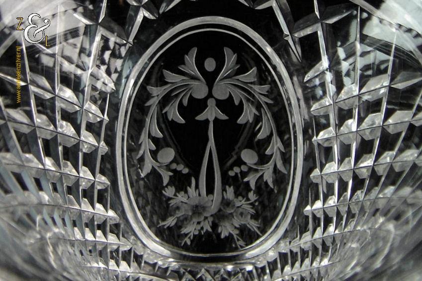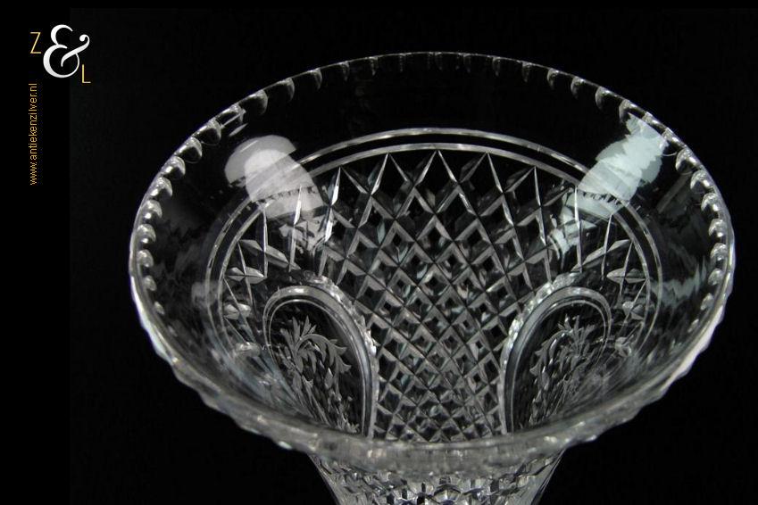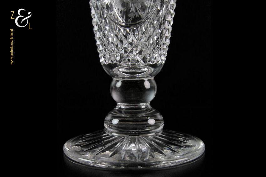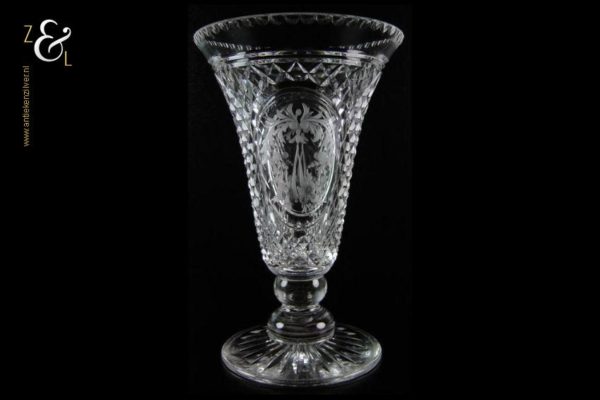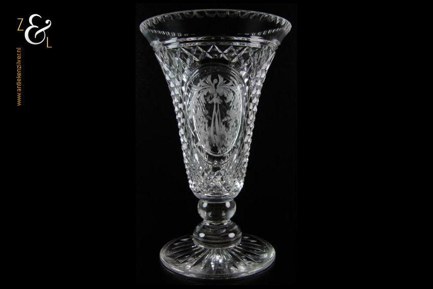 Deze kristallen vaas is vervaardigd in Nederland in de tweede helft van de 19e eeuw de zogenaamde Neostijl. De antieke vaas is mondgeblazen en op de hand ruitgeslepen en gepolijst en voorzien van twee ovale medaillons met daarin geëtste guirlandes en bloemen. Aan de onderzijde van de vaas is een ster geslepen, tevens zitten daar lichte krasjes dit zijn gebruikssporen die inherent zijn bij antiek kristal door jarenlang gebruik. De vaas weegt 848 gram is 20 cm hoog en heeft een diameter van 12.7 cm.
