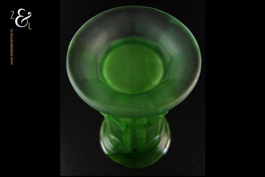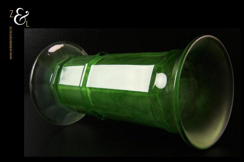 Deze groen gemarmerde Art Deco persglazen vaas is tussen 1928 en 1942 gemaakt bij de George Davidson & Co. Teams glasfabrieken. De Davidson model 279 vaas (in Engeland: green cloud glass vase) werd in drie maten gemaakt waarvan deze de middelste is. De vaas die voorzien is van negen vlakken heeft aan de buitenzijde een glanzend oppervlak en is aan de binnenkant mat wat een heel apart effect geeft hij weegt 766 gram is 20.7 cm hoog en heeft aan de bovenkant een diameter van 10.5 cm de voet heeft een diameter van 10.2 cm.