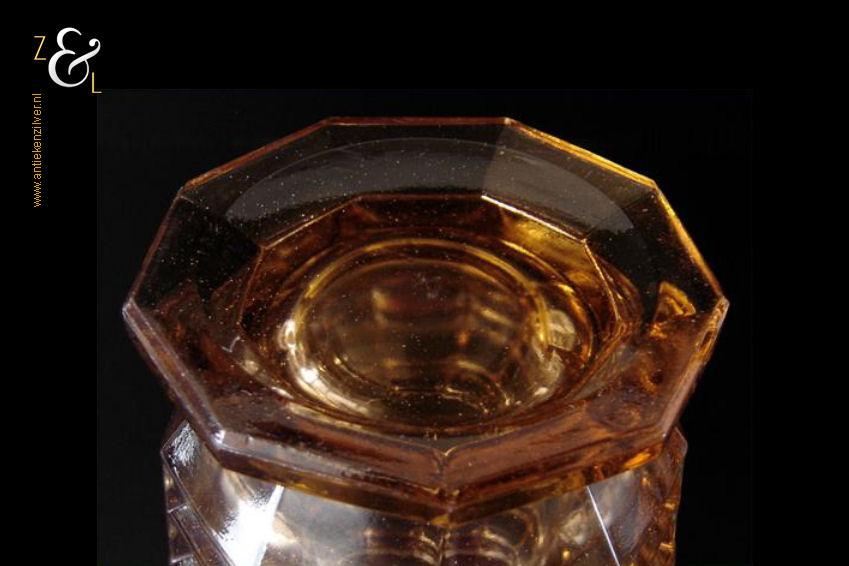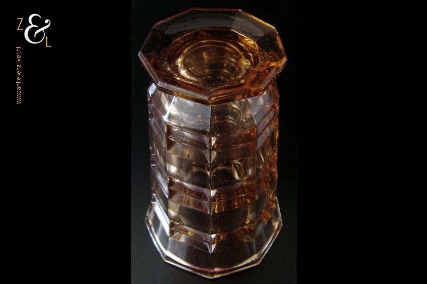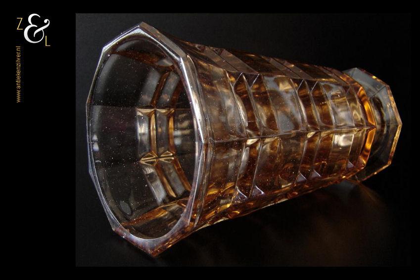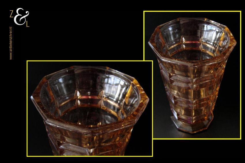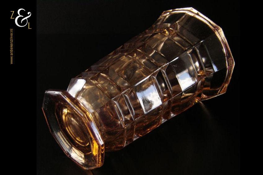 Deze mooie zware Art Deco vaas van roze persglas stamt uit Frankrijk waar hij rond 1930 gemaakt is. De vaas weegt 1363 gram is 20.5 cm hoog en heeft een diameter aan de bovenzijde van 13.2 cm en aan de onderzijde van 9 cm. Aan de onderzijde van de voet staat “made in France” en het nummer 4. De vaas heeft ingesloten luchtbelletjes die tijdens de productie ontstaan zijn.