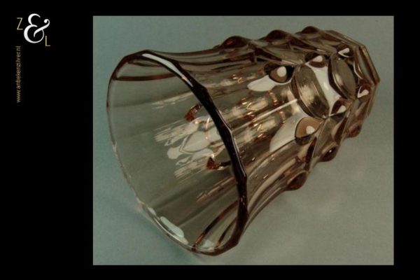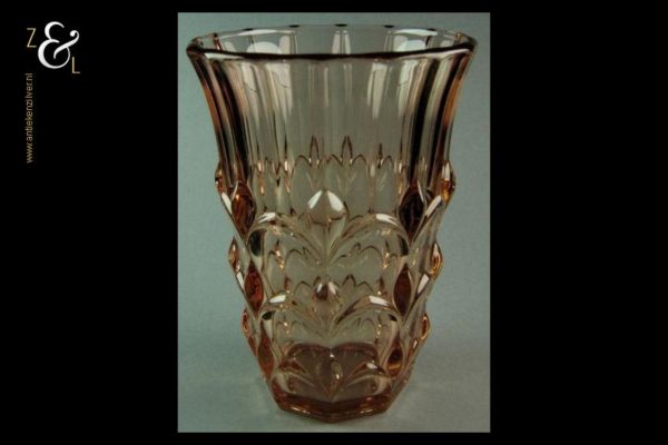 Deze originele roze Art Deco vaas model “Ronald” is in 1935 gemaakt bij de glasfabriek van Luxval te België. De persglazen vaas weegt 1700 gram is 21,5 cm hoog en heeft aan de bovenzijde een diameter van 15 cm en aan de onderzijde een diameter van 9 cm.