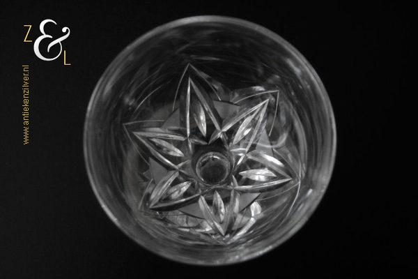 Dit bitterglas* is gemaakt in Nederland en stamt uit de tweede helft van de 20e eeuw omstreeks de zestiger- zeventiger jaren. Het in Art Deco stijl en in helder kristal vervaardigde bitterglas heeft een ronde voet, zeskantige steel en een kelk met daarop een handgeslepen stermotief. Het bitterglas weegt 108 gram en is 12.5 cm hoog. De kelk heeft een diameter van 5.8 cm de voet heeft een diameter van 5.7 cm.
