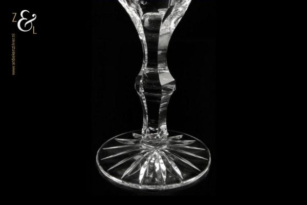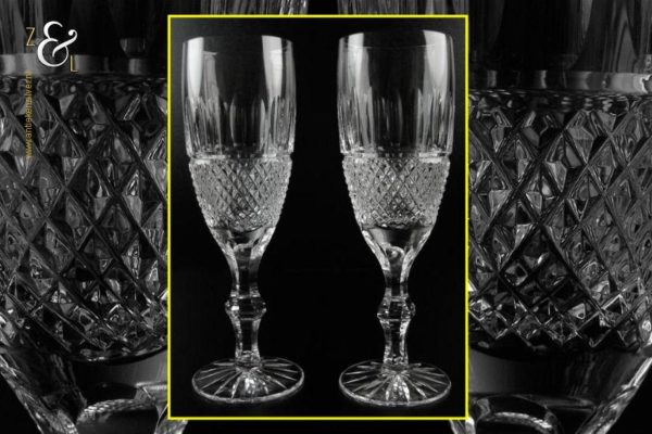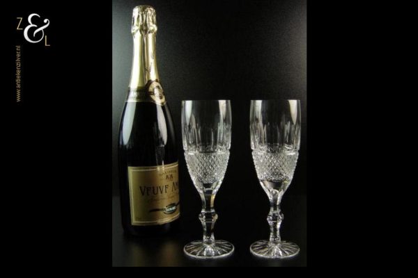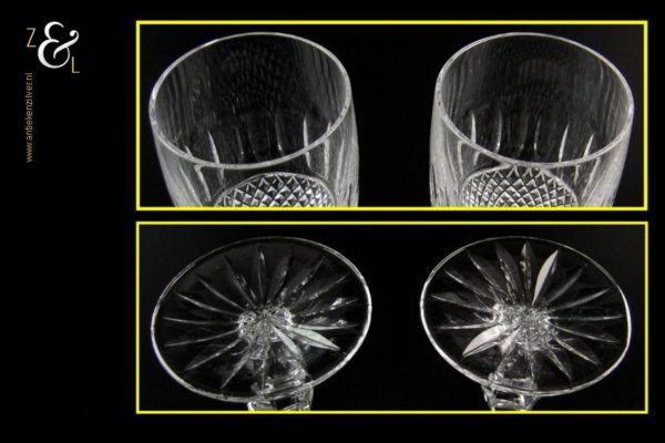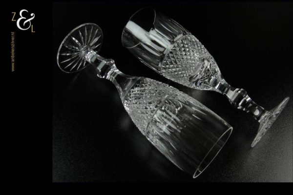 Dit stel kristallen champagneglazen is gemaakt in Luik / Seraing België bij de kristal- en glasfabriek Val Saint Lambert omstreeks de helft van de 20e eeuw. De mondgeblazen handgeslepen en gepolijste glazen hebben onder de voet een geslepen ster die tot aan de rand doorloopt, zijn voorzien van een zeskantige stam en zijn aan de onderzijde van de kelk ruitgeslepen. De champagneglazen wegen samen 514 gram en zijn 18.1 cm hoog. De bovenkant van de glazen hebben een diameter van 5.7 cm en de voet meet 6.1 cm.