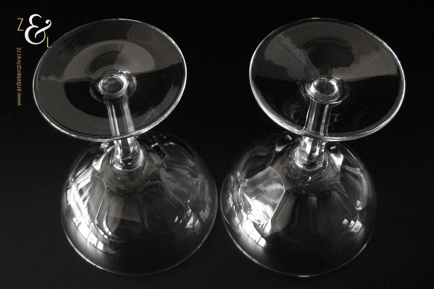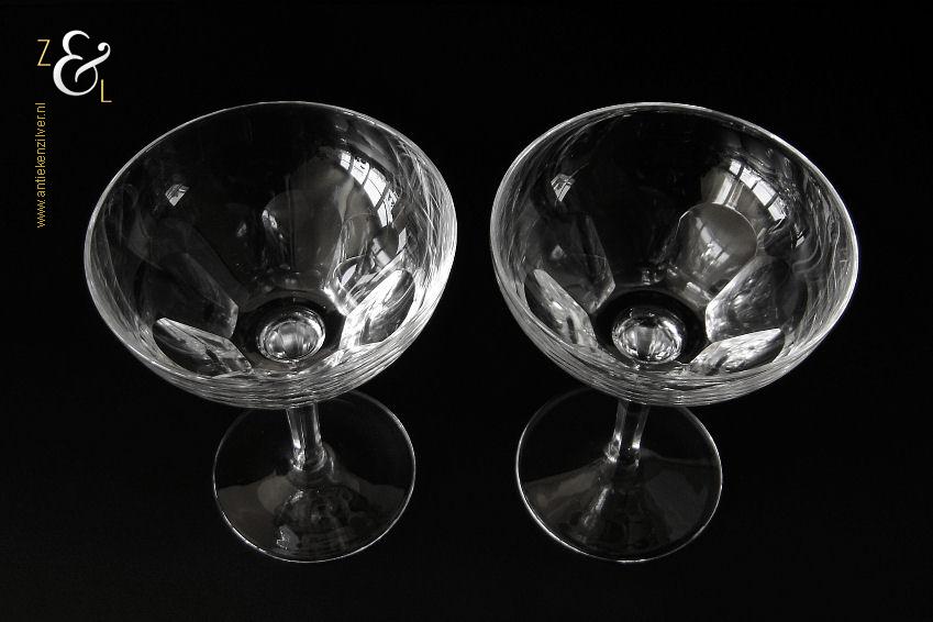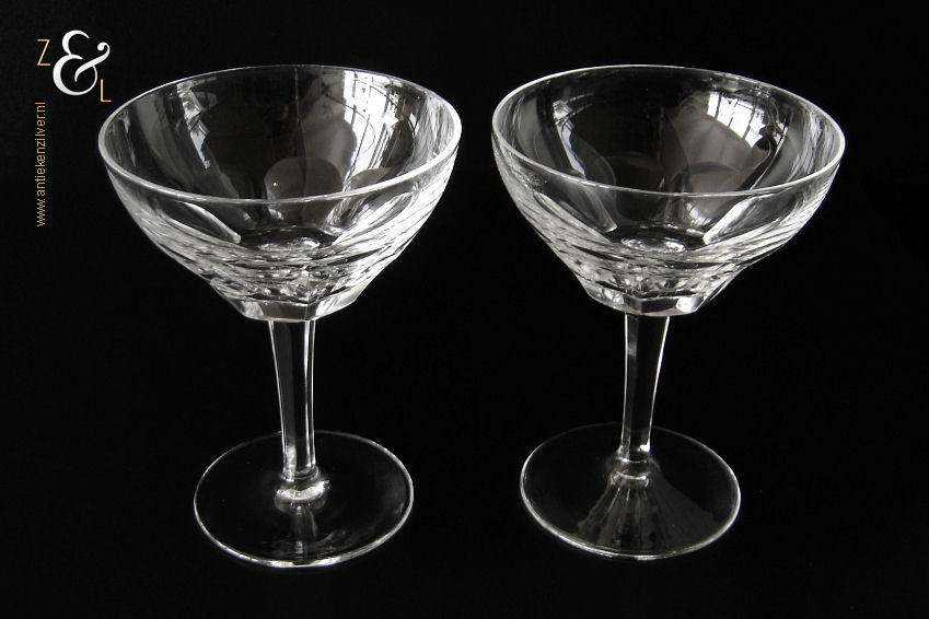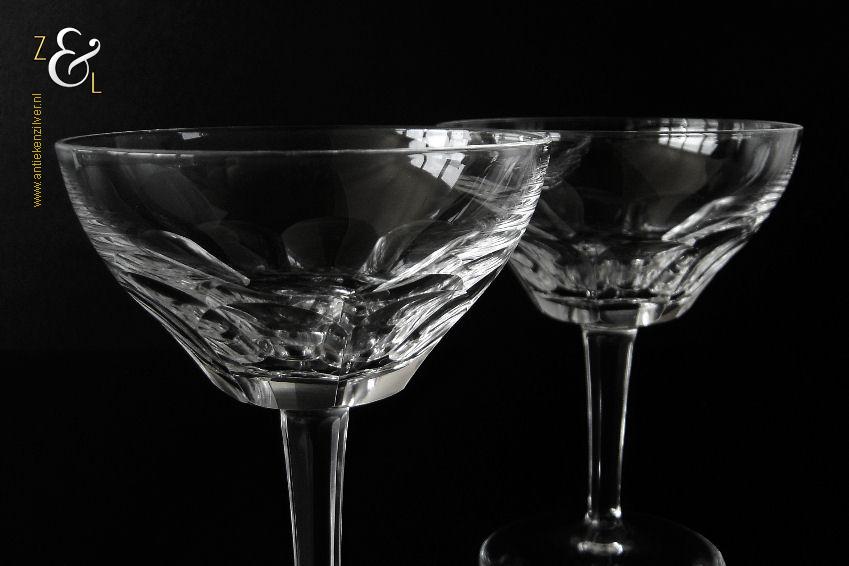 Dit stel champagneglazen / champagnecoupes / champagneschalen / likeurglazen model Julien is een ontwerp uit 1937 van de Nederlandse glasontwerper Willem Jacob Rozendaal en uitgevoerd bij de Kristal- en glasfabriek Kristalunie Maastricht. De zware in Art Deco stijl en in helder kristal vervaardigde glazen hebben een ronde voet met achtkantige steel en een kelk met acht ronde platribben. De champagneglazen / champagnecoupes / champagneschalen / likeurglazen wegen 503 gram en zijn 13.3 cm hoog. De bovenzijde van de glazen hebben een diameter van 10.2 cm en de voet heeft een diameter van 7.4 cm. Het glasservies Julien is op ambachtelijke wijze op de hand in een vorm mondgeblazen, hierdoor kunnen er kleine imperfecties optreden en hebben de glazen onderling een klein verschil in gewicht. Het glasservies Julien was zéér populair bij de afnemers van de Kristalunie en werd tot aan het begin van de jaren zestig geproduceerd.