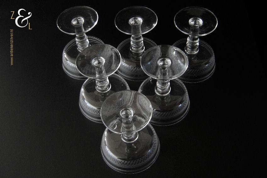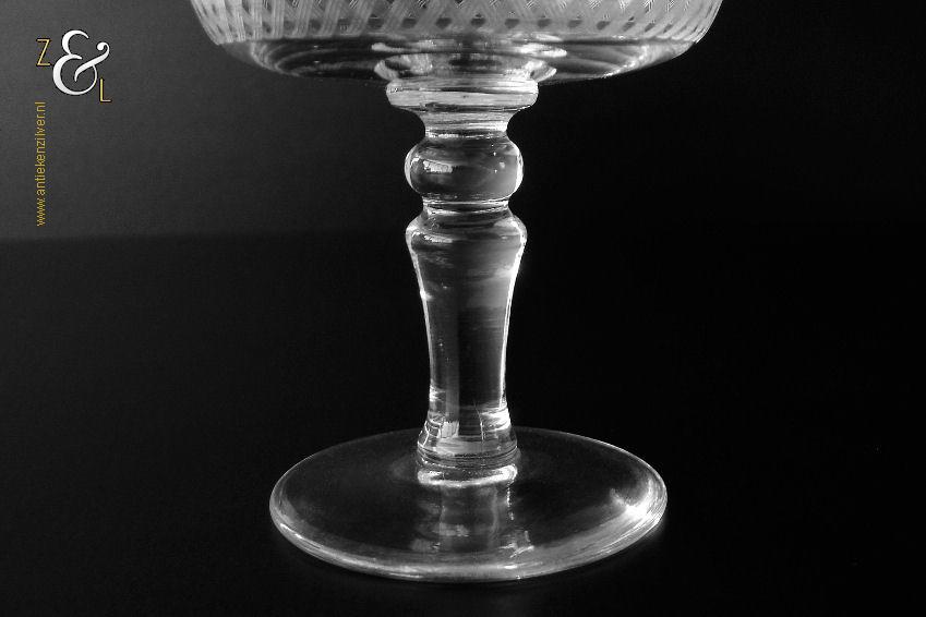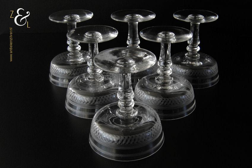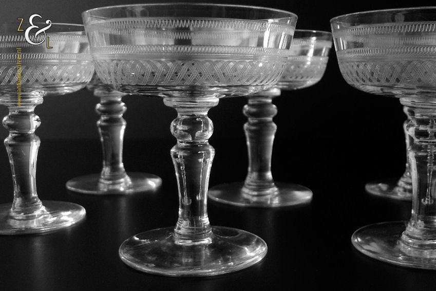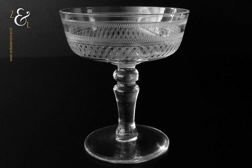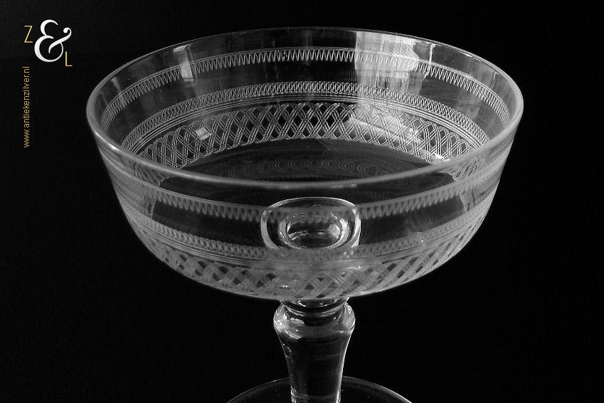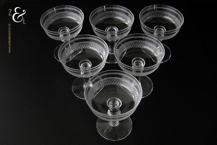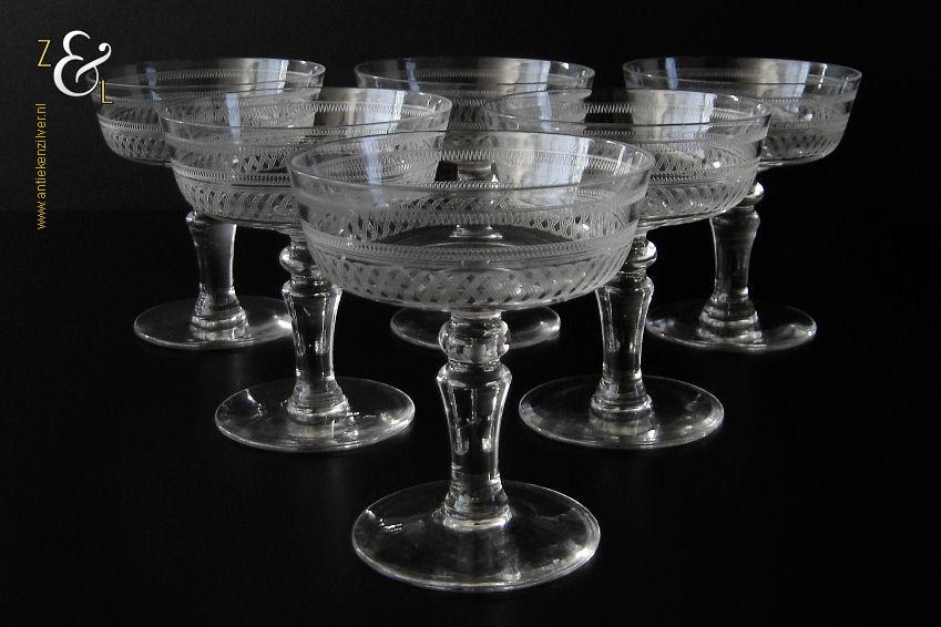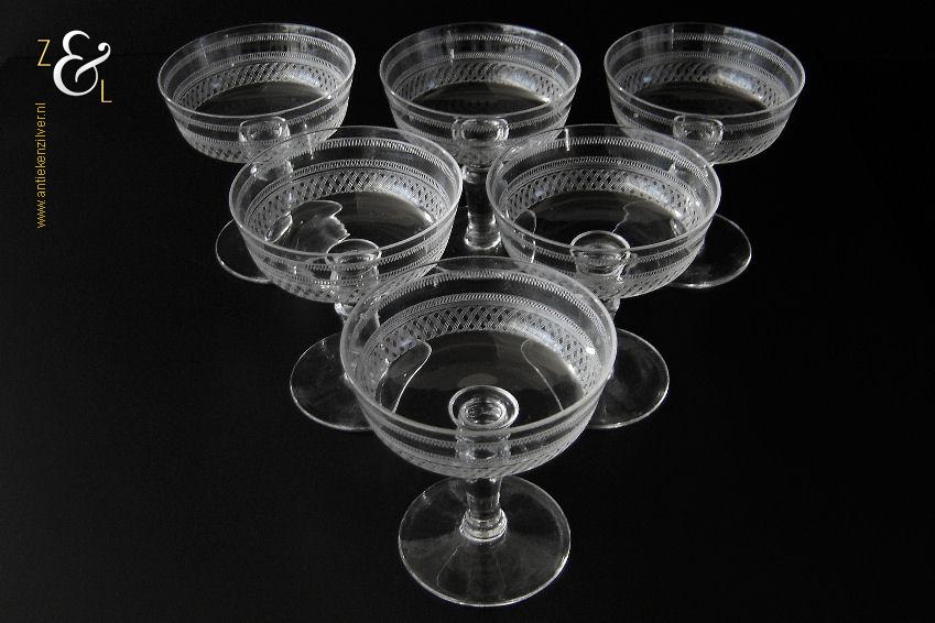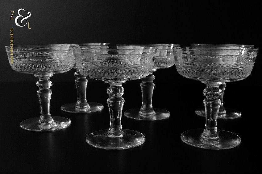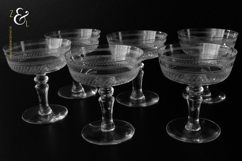 Deze zes kristallen champagneglazen / champagnecoupes zijn vermoedelijk gemaakt in Leerdam bij de Kristal en Glasfabriek Leerdam aan het einde van de 19e en het begin van de 20e eeuw. De met verschillende motieven geguillocheerde en geëtste glazen hebben een balustervormige steel met onder de kelk een knoop. De champagneglazen / champagnecoupes wegen samen 830 gram en zijn 10.2 cm hoog. De bovenzijde van de glazen hebben een diameter van 9 cm en de voet heeft een diameter van 6.8 cm. De zes champagneglazen / champagnecoupes zijn op ambachtelijke wijze op de hand in een vorm mondgeblazen, hierdoor kunnen er kleine imperfecties optreden en hebben de glazen onderling een klein verschil in gewicht.