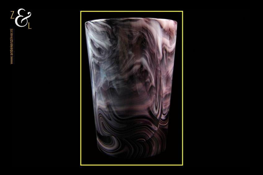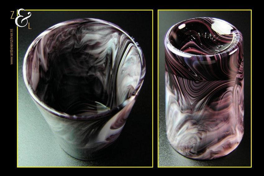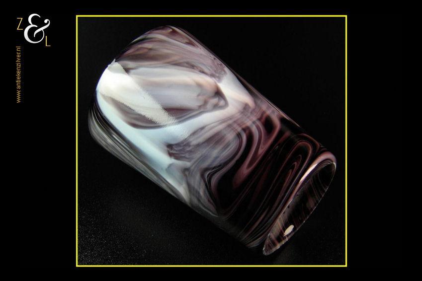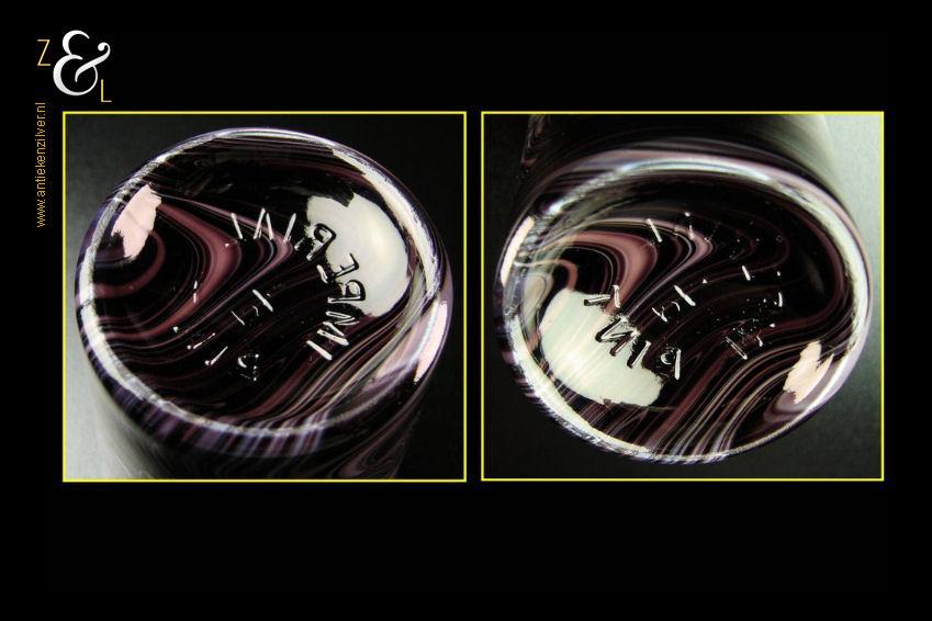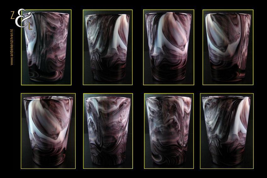 Dit persglazen bierglas / waterglas is gemaakt in Engeland tijdens de tweede helft van de 19e eeuw (circa 1880) de Victoriaanse periode die liep van 1837 tot 1901. Het bierglas dat is uitgevoerd in het zogenaamde paars met witte malachiet of slag glass heeft een hoogte van 10.7 cm een diameter van 6.7 cm en weegt 216 gram. Aan de onderzijde van het glas staat in spiegelschrift 1/2 Imperial Pint wat betekent dat het een inhoudsmaat van 284 milliliter heeft.