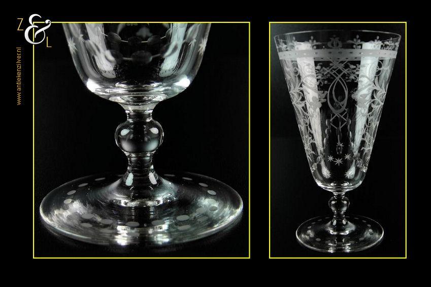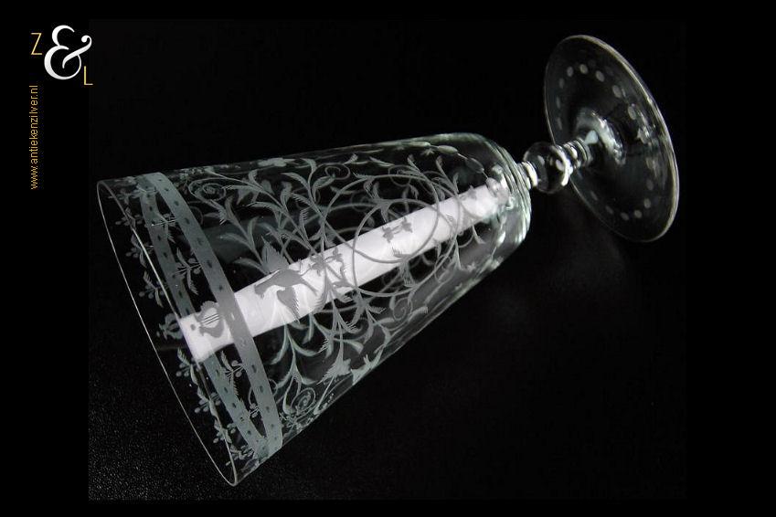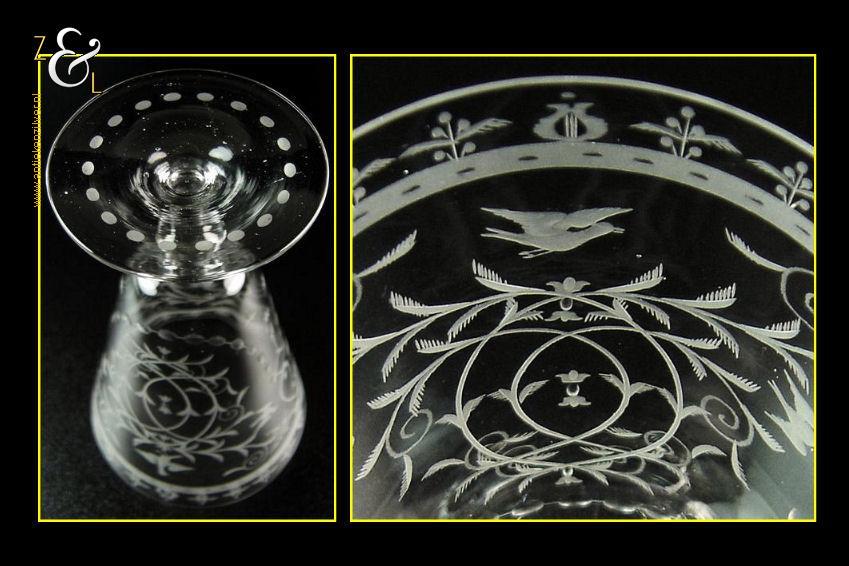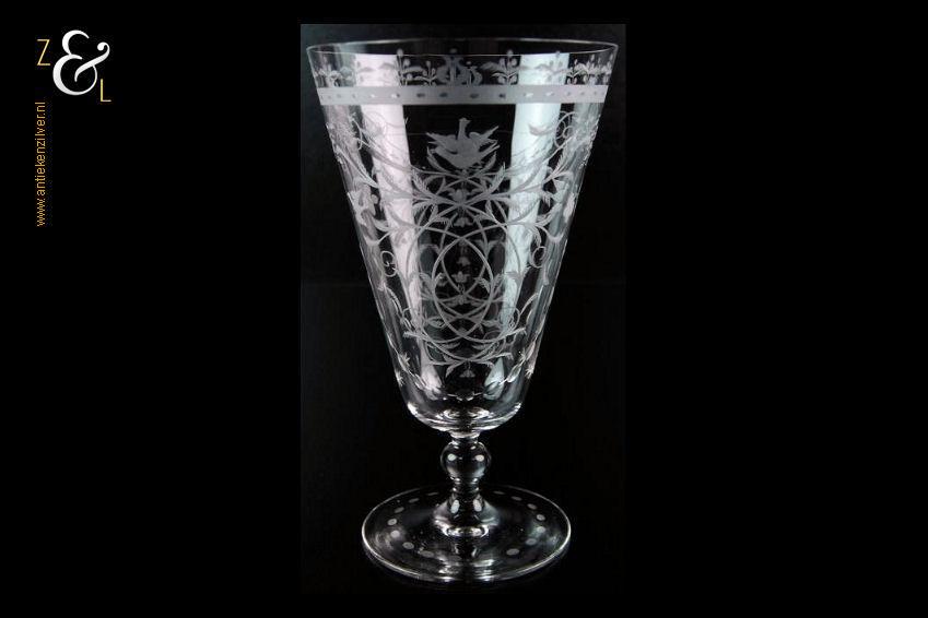 Dit Hollandse kristallen huwelijksglas stamt uit het einde van de 19e en het begin van de 20e eeuw. Het zéér licht uitgevoerde glas is fijntjes gedecoreerd met duifjes en guirlandes. Het mondgeblazen handgeslepen en geëtste glas weegt 59 gram is 12.5 cm hoog en heeft een diameter van 7.5 cm.