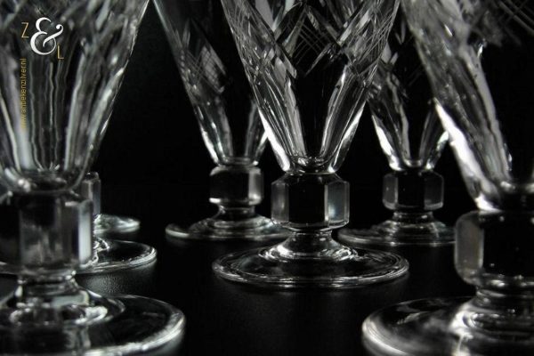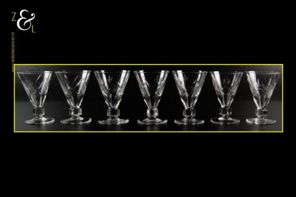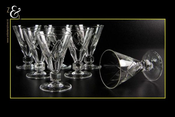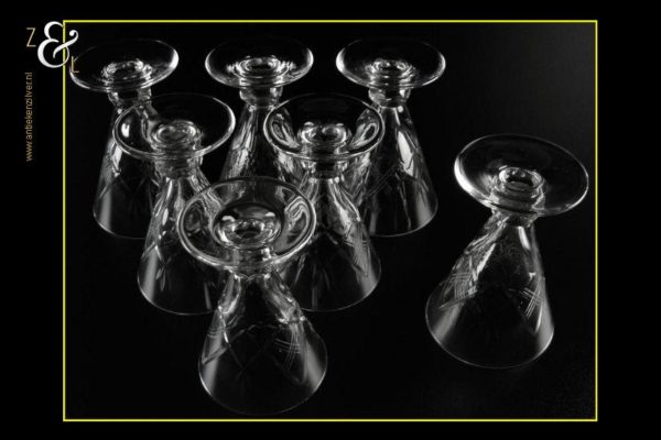 Deze zeven cocktail- likeurglazen model Prince Baudouin (Prins Boudewijn) zijn gemaakt in België bij de Doyen glasfabriek / Verrerie Doyen die is opgericht in 1909 en gesloten in 1987. De mondgeblazen handgeslepen en gepolijste glazen zijn uitgevoerd met ruit en waaier slijpsel en hebben een zeskantige steel, ze meten 10.5 cm hoog hebben een diameter van 7.2 cm en wegen samen 791 gram.