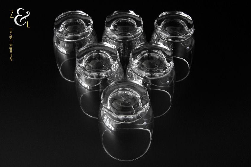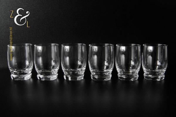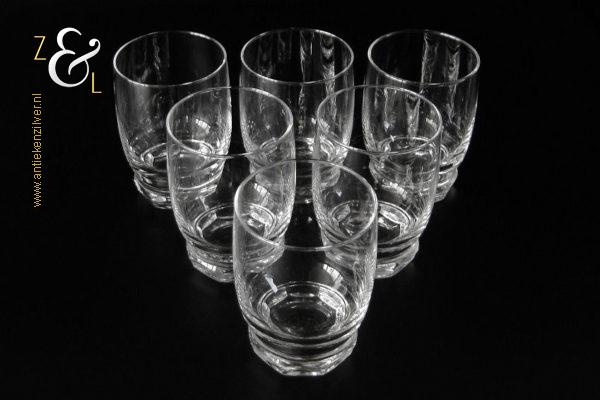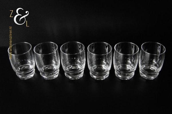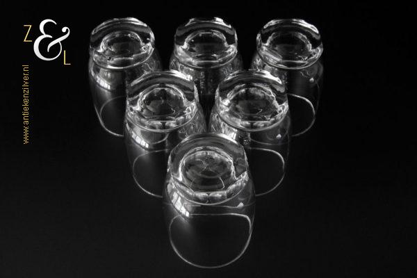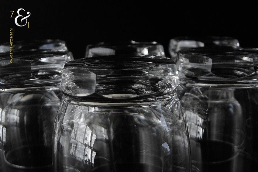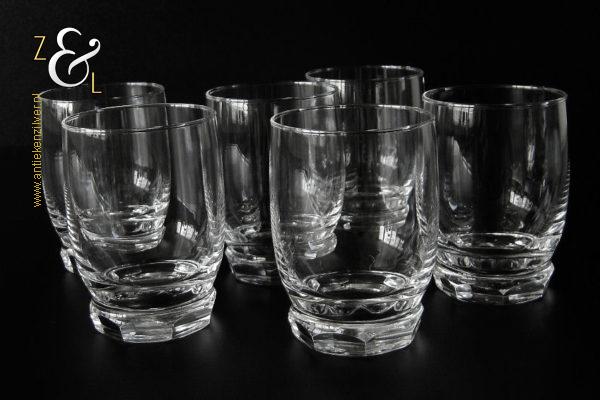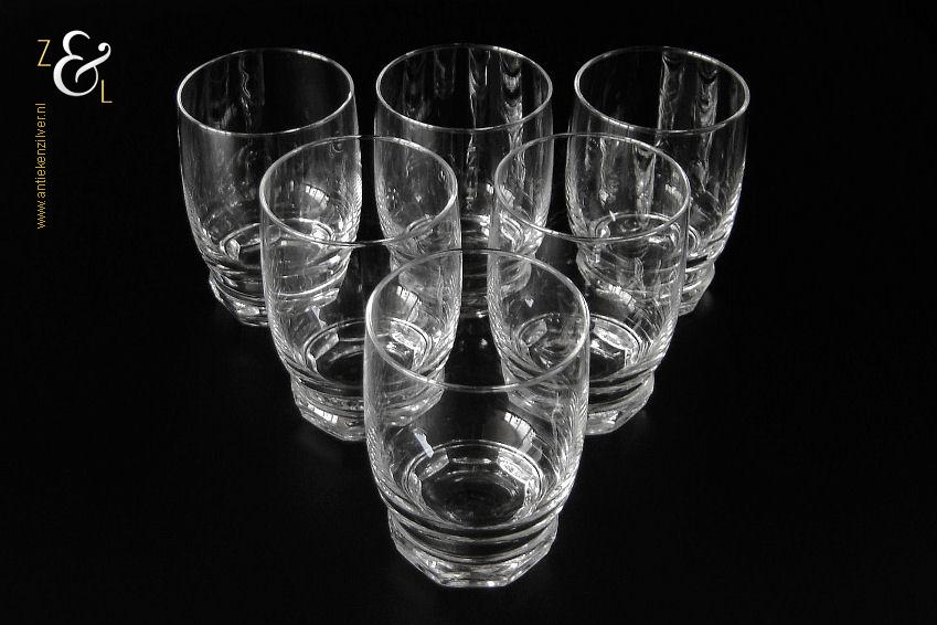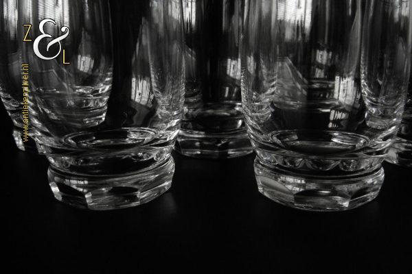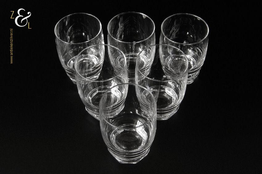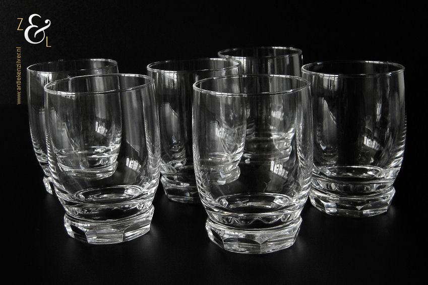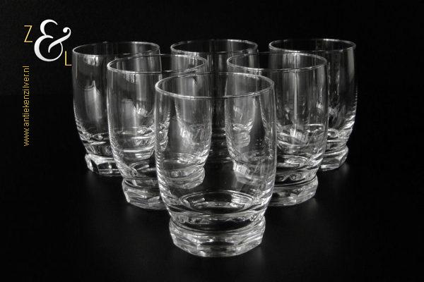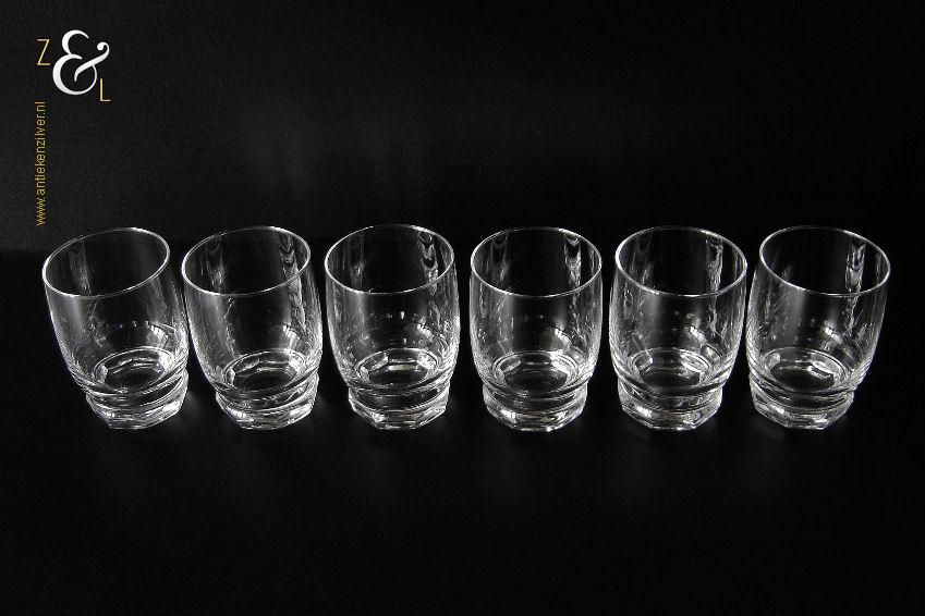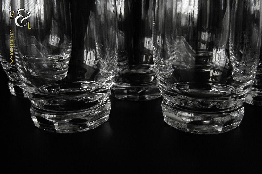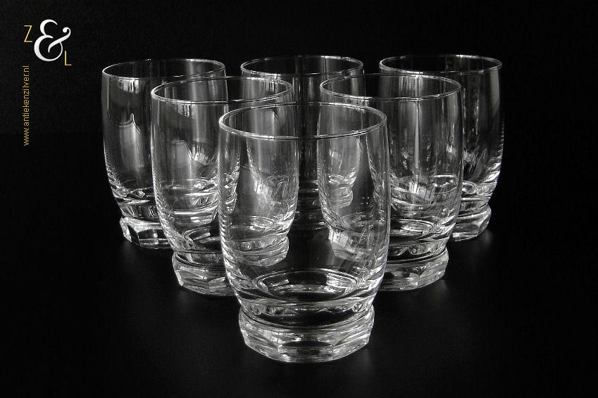 Deze zes limonadeglazen / limonadebekers model Rumba zijn een ontwerp uit 1948 van de wereldberoemde Nederlandse glasontwerper Andries Dirk Copier en uitgevoerd bij de Glasfabriek Leerdam. De in Art Deco stijl en in helder kristal vervaardigde limonadeglazen / limonadebekers hebben een achtkantige voet met lenzen. De zes limonadeglazen / limonadebekers wegen 906 gram hebben een diameter van 6.2 cm en zijn 8.6 cm hoog. Het glasservies Rumba is op ambachtelijke wijze op de hand in een vorm mondgeblazen, hierdoor kunnen er kleine imperfecties optreden en hebben de glazen onderling een klein verschil in gewicht.