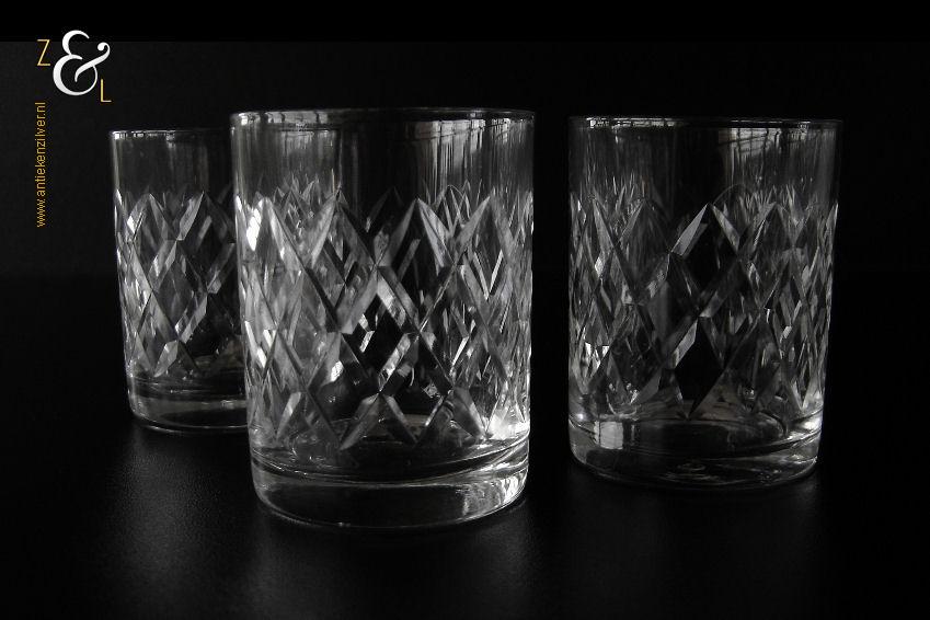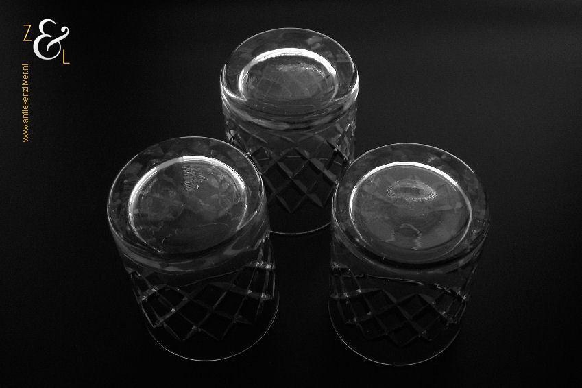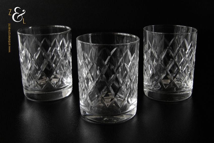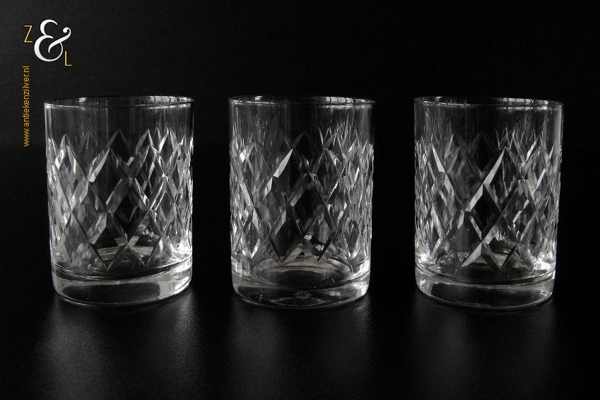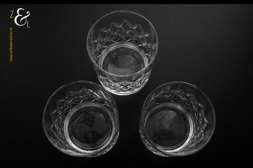 Deze drie kristallen whiskey- whiskytumblers zijn gemaakt in Brussel België bij de kristalslijperij Cristallerie Robert Bruxelles. De mondgeblazen handgeslepen en gepolijste whiskey- whiskytumblers zijn ruit geslepen en stammen uit de zestiger jaren. De drie kristallen whiskey- whiskytumblers wegen samen 302 gram zijn 7 cm hoog en hebben een diameter van 5.4 cm.