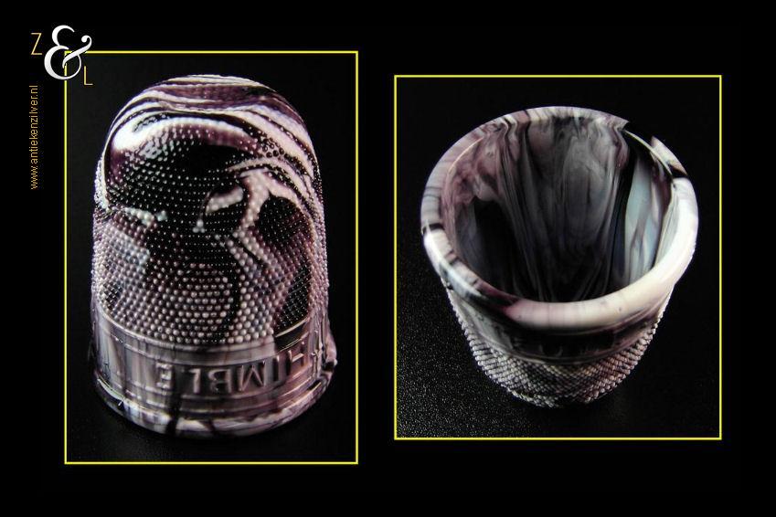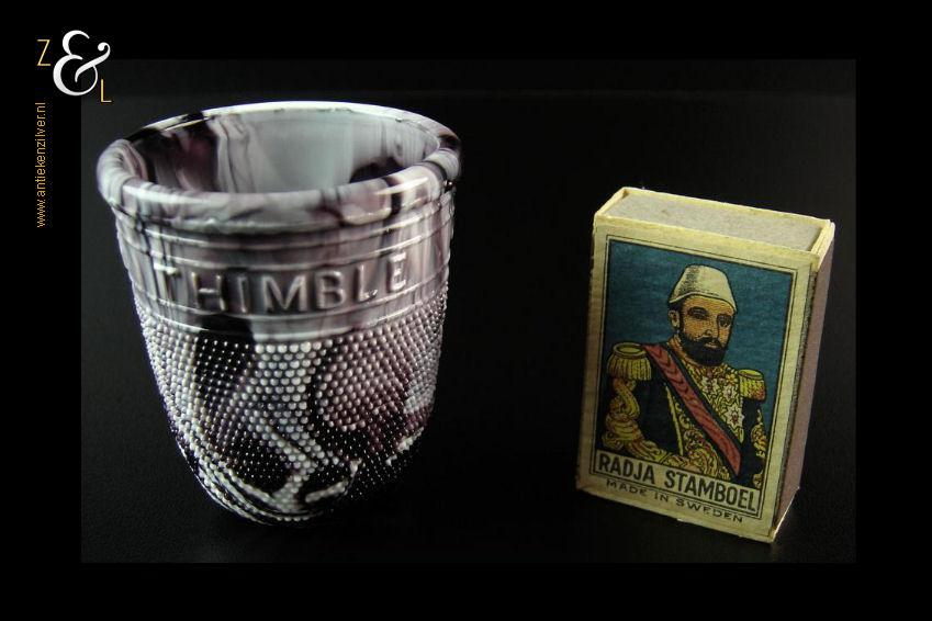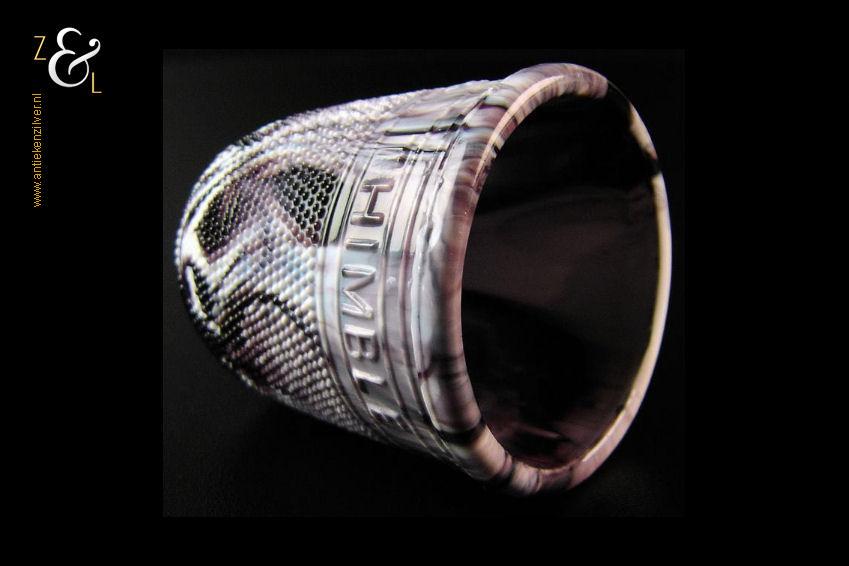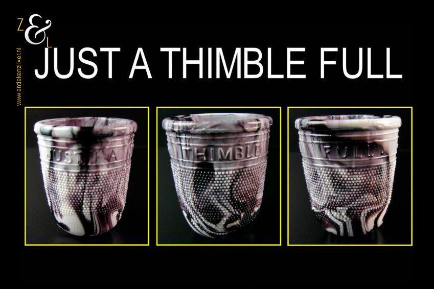 Deze persglazen maatbeker / maatglas voor whiskey / whisky is rond 1880 gemaakt bij George Davidson & Co. Teams glasfabrieken. Het zogenaamde paars met witte malachiet of slag glass heeft het opschrift “Just A Thimble Full” wat zoveel betekent als “gewoon een vingerhoed vol” dit geeft de indruk dat het glas maar met een kleine hoeveelheid whiskey gevuld werd en de ontvanger maar een kleine hoeveelheid zou consumeren, het tegendeel is waar omdat de maatbeker traditioneel veel groter is dan een gewone vingerhoed. De glazen maatbeker weegt 82 gram is 6.3 cm hoog en heeft een diameter van 5.7 cm.