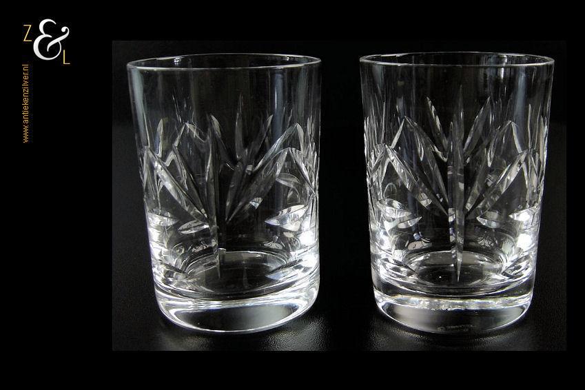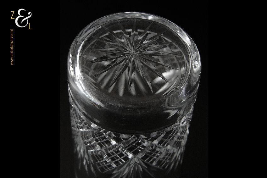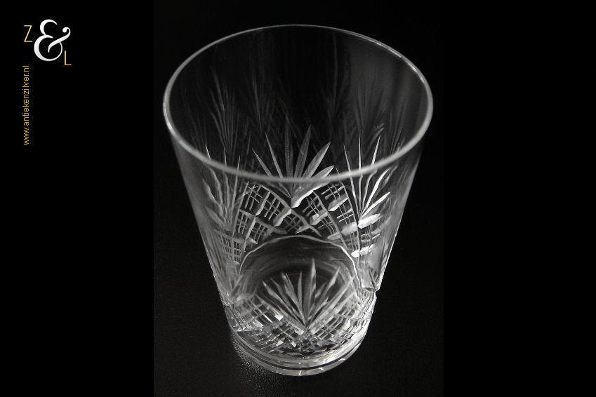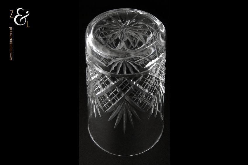 Dit kristallen whiskey- whiskyglas is in de eerste helft van de 20e eeuw (veertiger jaren) in Nederland gemaakt. Het mondgeblazen en in ruit en waaier handgeslepen en gepolijste glas weegt 99 gram is 10.1 cm hoog en heeft een diameter van 6.5 cm aan de onderzijde van dit glas is een ster geslepen.